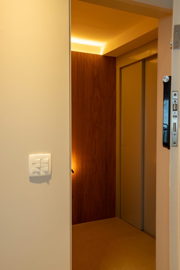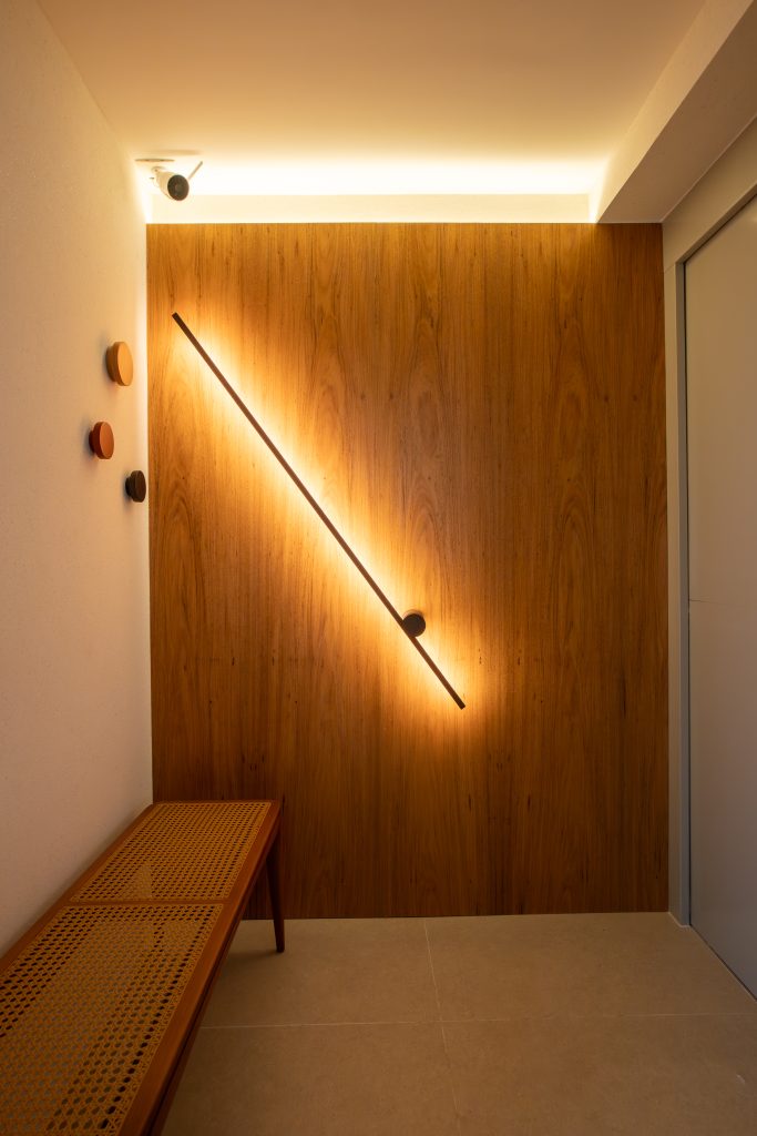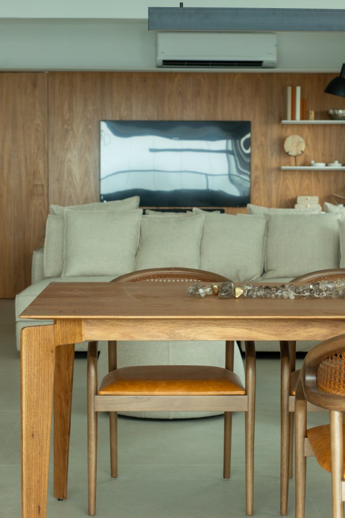 A materialidade nesse projeto é tratada como linguagem poética. O freijó natural reveste painéis, marcenarias, estabelecendo uma base quente e acolhedora. O painel em laca bege funciona como solução estética e funcional, escondendo as passagens para o lavabo e hall social.