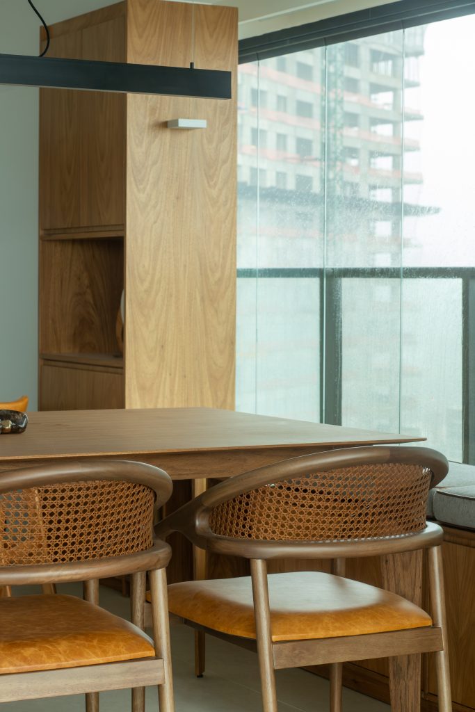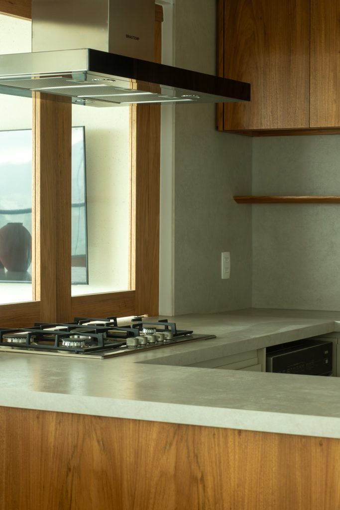 Com a alteração da planta original, os moradores ganharam uma área de churrasqueira integrada, que conta com uma marcenaria em tons claros e ampla bancada em lâmina Dimond Fokos, a qual se estende transformando-se na área da cozinha formando um espaço único e compartilhado. O mesmo pode ser dividido por uma janela tipo camarão, que se transforma em uma imponente porta em freijó natural e vidro, dando continuidade para a área do jantar.