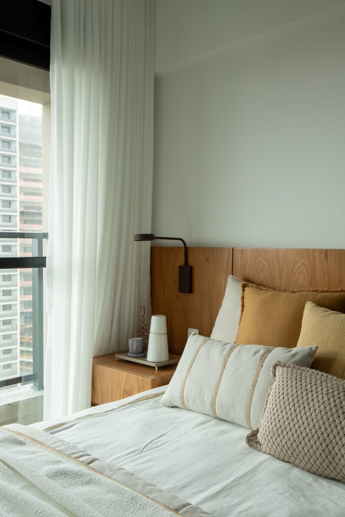 Nos ambientes íntimos, a paleta e linguagem mantém a serenidade da área social, com o diferencial do piso em madeira Cumaru que traz uma escala mais íntima e aconchegante.