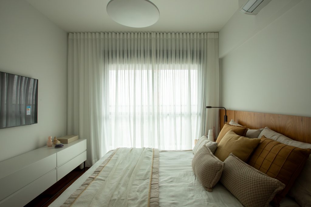 O escritório, que também atua como quarto de hóspedes, reafirma a versatilidade do projeto. O ambiente se molda às demandas do cotidiano: ora espaço de trabalho iluminado e silencioso, ora quarto acolhedor para receber visitas. A marcenaria sob medida, mais uma vez, garante a praticidade sem abrir mão da estética.