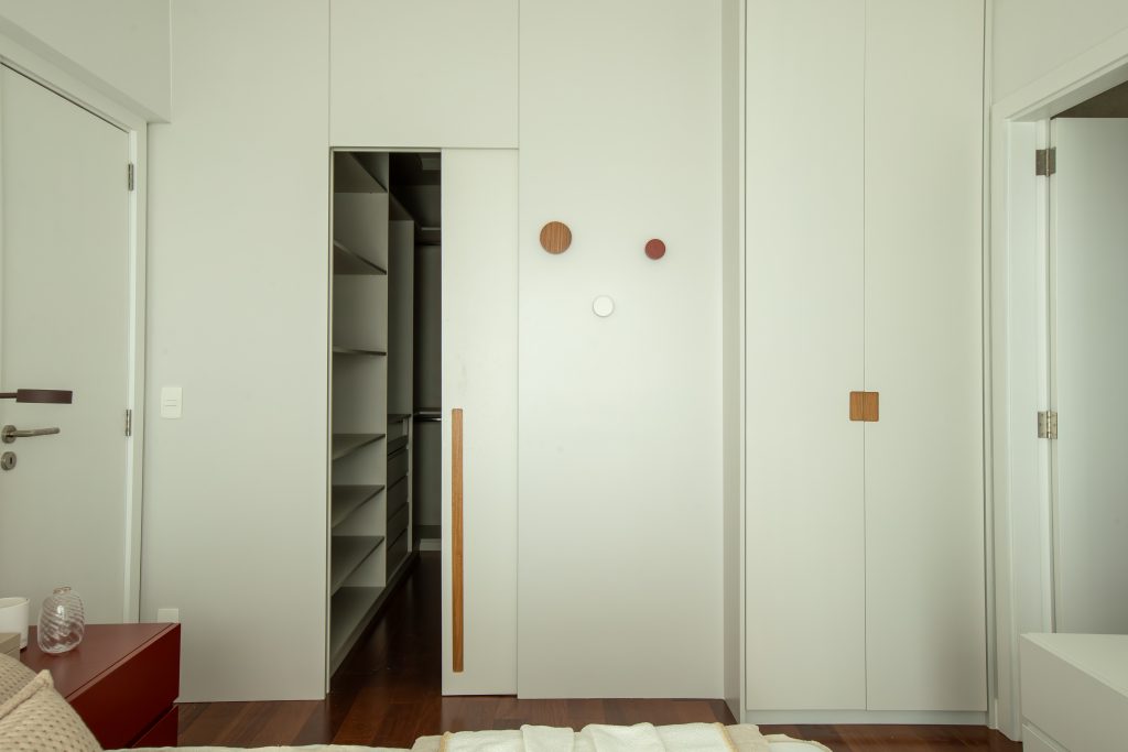 O quarto do casal cria uma atmosfera de refúgio, onde a madeira contrasta suavemente com o tom forte avermelhado da mesinha de cabeceira feita em laca, em diálogo com o restante da casa, mas com seu próprio sopro de calma.