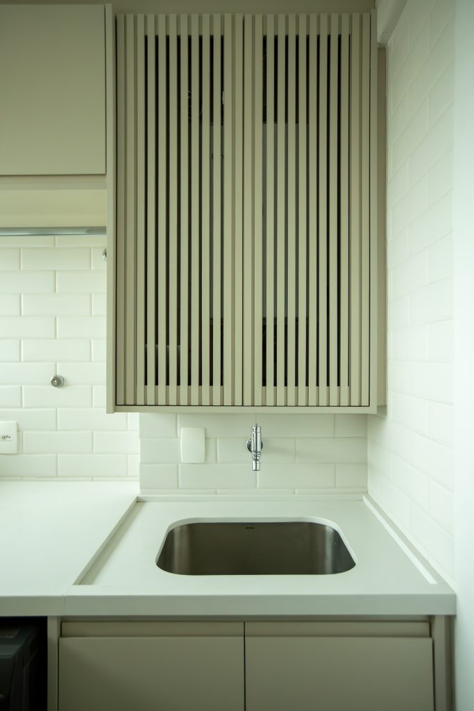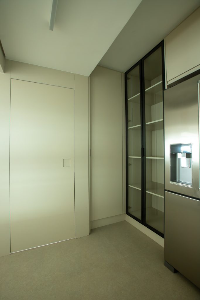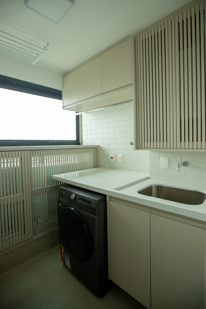 A cozinha se estende para a área de despensa e lavanderia através de paineis em marcenaria no tom Bege Matt que proporcional uma continuidade e integração com o restante do espaço aberto.