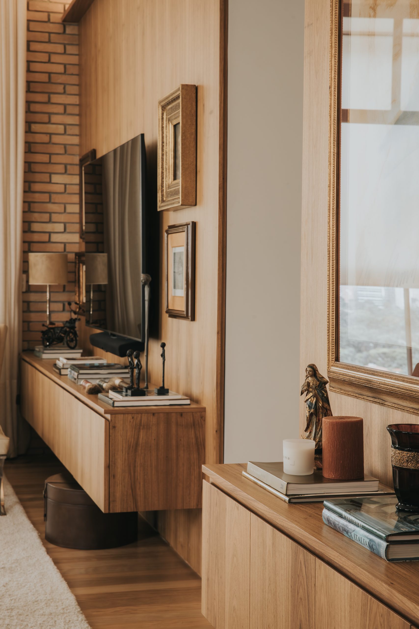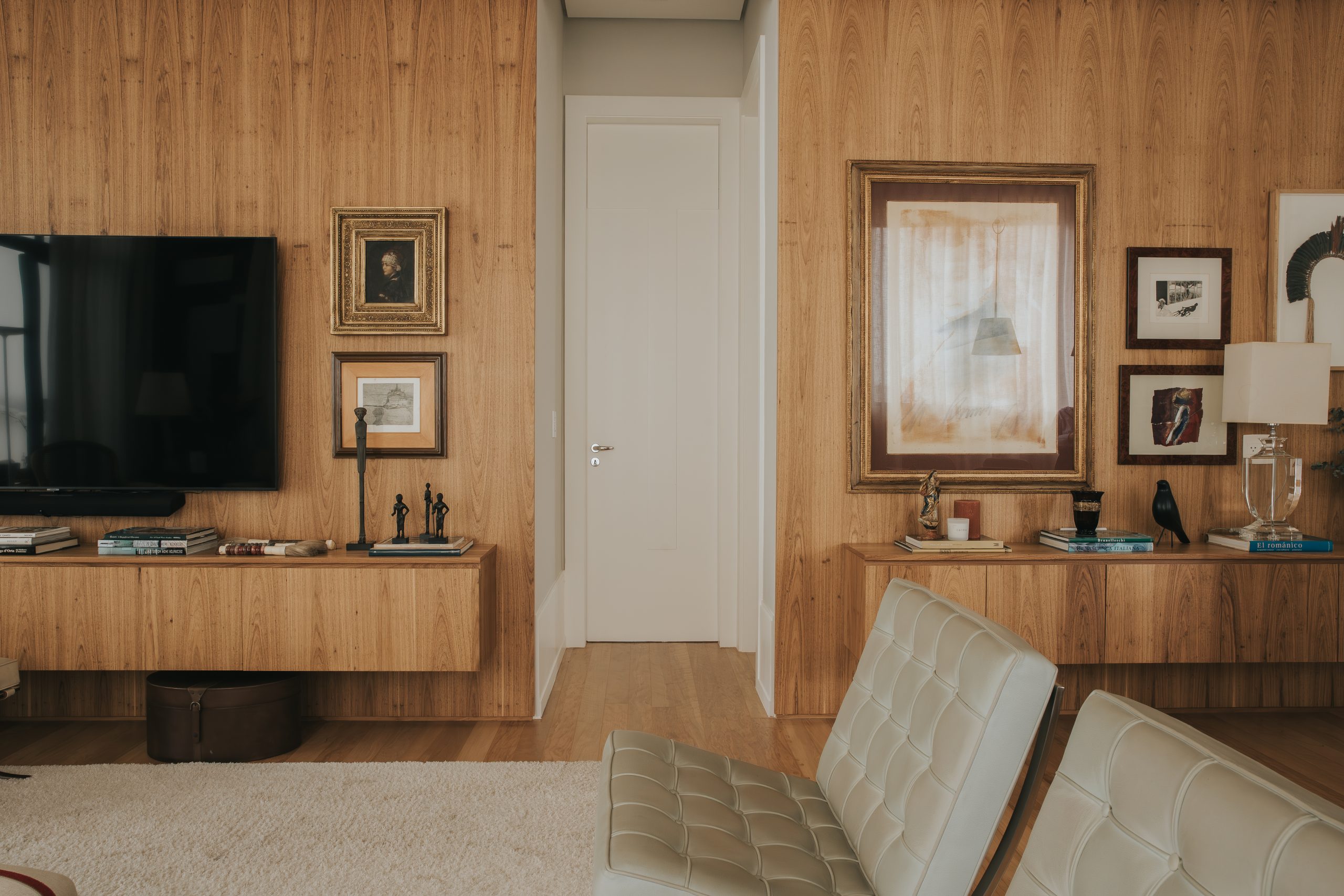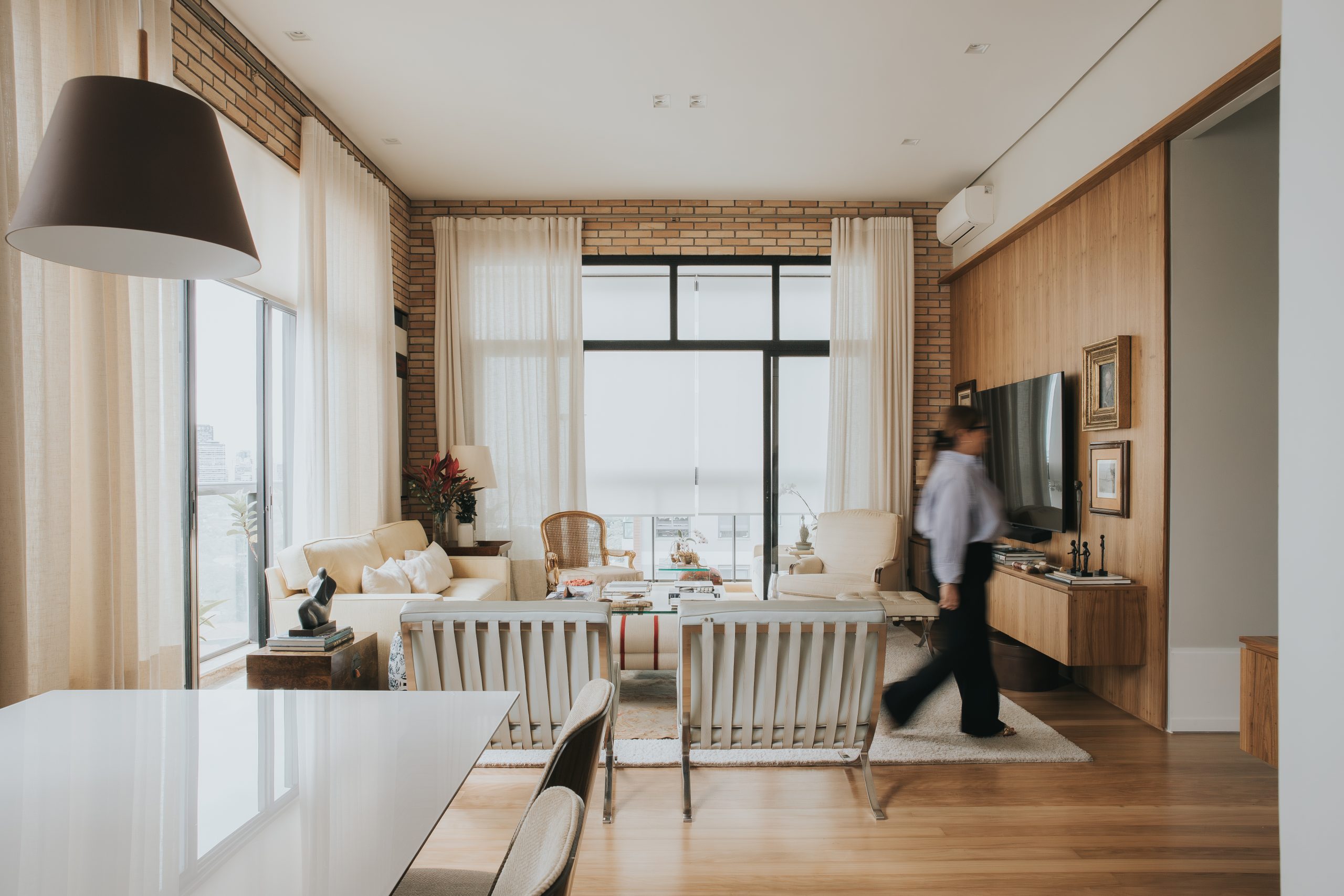 Desenvolvemos um minucioso projeto comprometido em conectar os aspectos relevantes da moradia anterior com o que encontramos no novo endereço. Pé direito alto, tijolinhos aparentes, janelas amplas: clean e arejado, o imóvel mescla o charme novaiorquino com a luz brasileira presente na paisagem urbana. O projeto buscou trazer mais calor para o interior, utilizando para isso elementos como a madeira, cortinas, tapetes, a iluminação. Na área de estar, a integração entre os ambientes foi executada com a aplicação de painéis de madeira, que abrem e fecham entre a cozinha e as salas, preservando a privacidade quando necessário. Nos detalhes, a presença da arte e peças da história familiar. No hall forrado com tecidos, colocamos as arandelas feitas de alabastro que no passado decoravam a casa de ancestrais da família na Itália. Explorando toda a sua beleza e significado, essas peças também iluminam o lavabo, transformado pela arte, onde uma cuba esculpida em mármore Taj Mahal dá match com o alabastro.