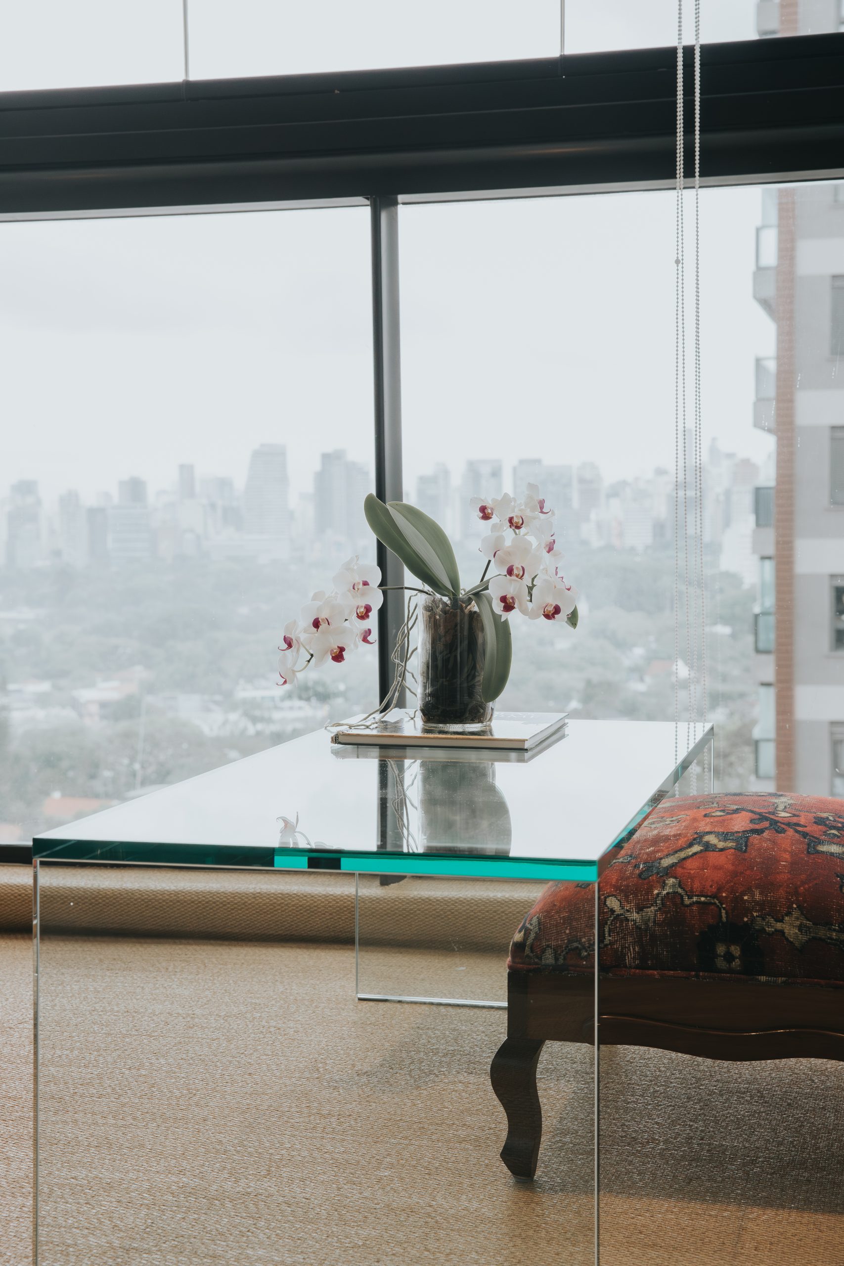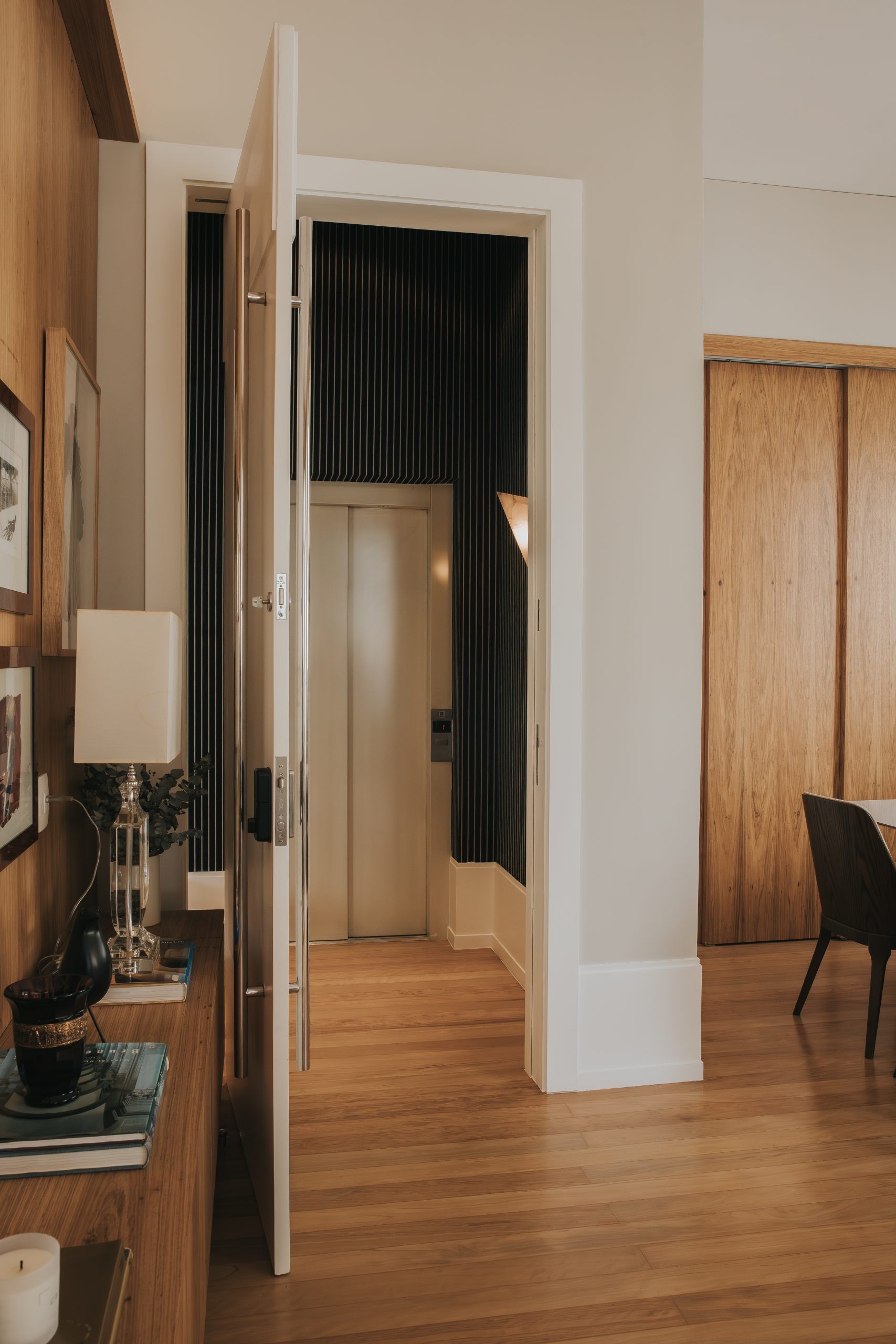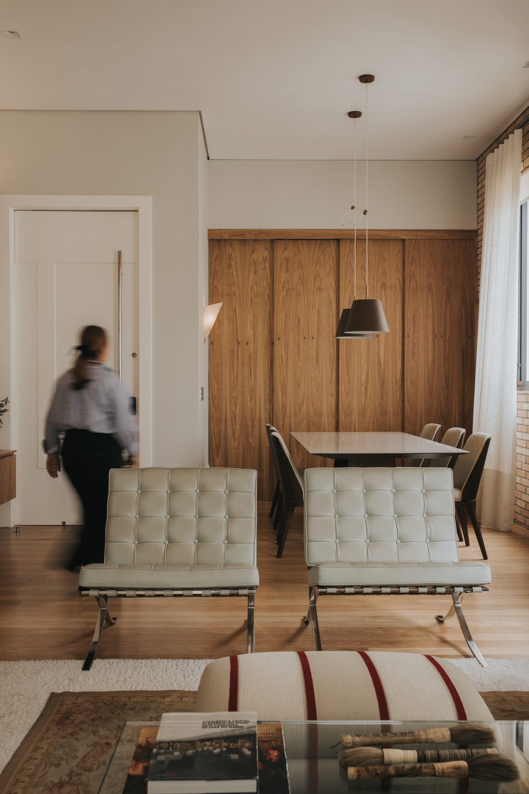 Desenvolvemos um minucioso projeto comprometido em conectar os aspectos relevantes da moradia anterior com o que encontramos no novo endereço. Pé direito alto, tijolinhos aparentes, janelas amplas: clean e arejado, o imóvel mescla o charme novaiorquino com a luz brasileira presente na paisagem urbana. O projeto buscou trazer mais calor para o interior, utilizando para isso elementos como a madeira, cortinas, tapetes, a iluminação. Na área de estar, a integração entre os ambientes foi executada com a aplicação de painéis de madeira, que abrem e fecham entre a cozinha e as salas, preservando a privacidade quando necessário. Nos detalhes, a presença da arte e peças da história familiar. No hall forrado com tecidos, colocamos as arandelas feitas de alabastro que no passado decoravam a casa de ancestrais da família na Itália. Explorando toda a sua beleza e significado, essas peças também iluminam o lavabo, transformado pela arte, onde uma cuba esculpida em mármore Taj Mahal dá match com o alabastro.