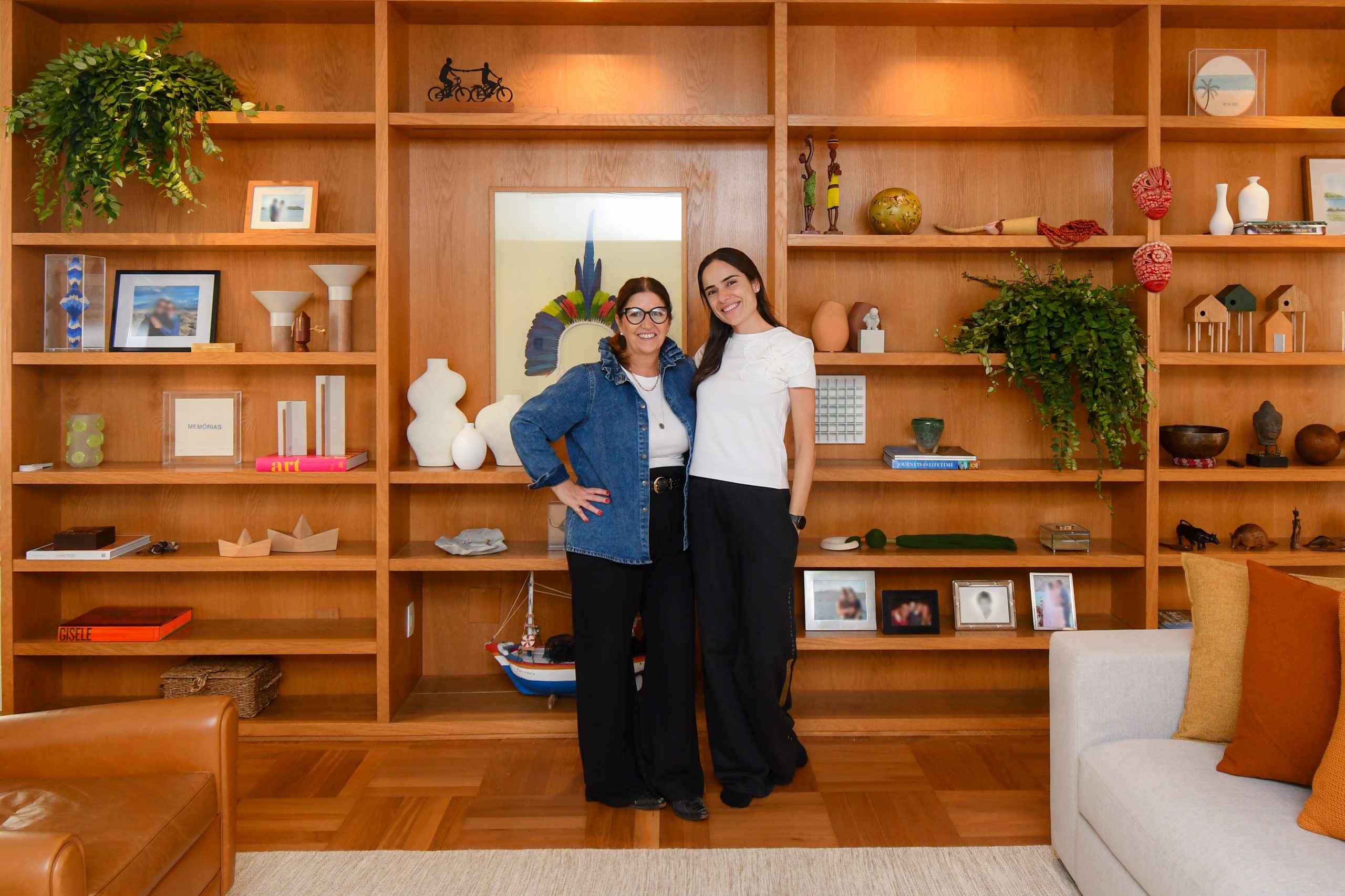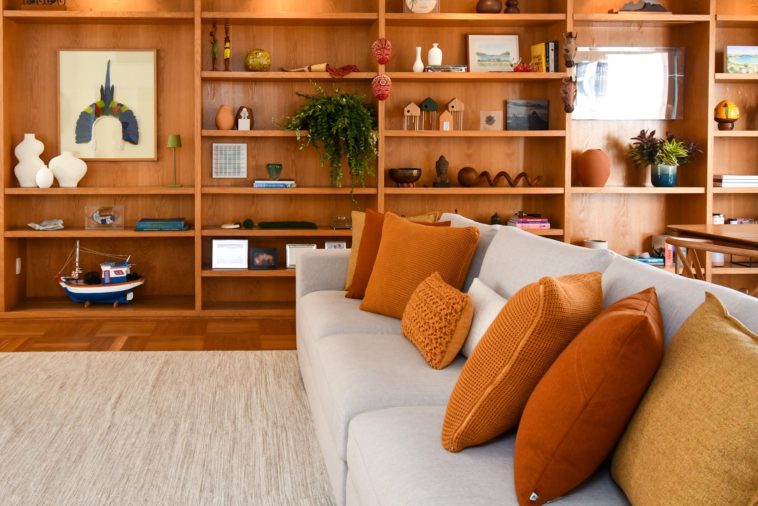 A ampla sala integra estar e jantar sob o mesmo gesto de aconchego e sofisticação. O mobiliário solto, em tons neutros e linhas puras, cria uma base serena, pontuada por nuances terrosas e acentos de cor que aquecem o olhar e trazem vitalidade. A estante de madeira, agora repaginada por essa nova curadoria, torna-se o coração do projeto: abriga livros, esculturas, arte popular, lembranças de viagens e pequenas obras de arte — um verdadeiro painel tridimensional da vida do casal.