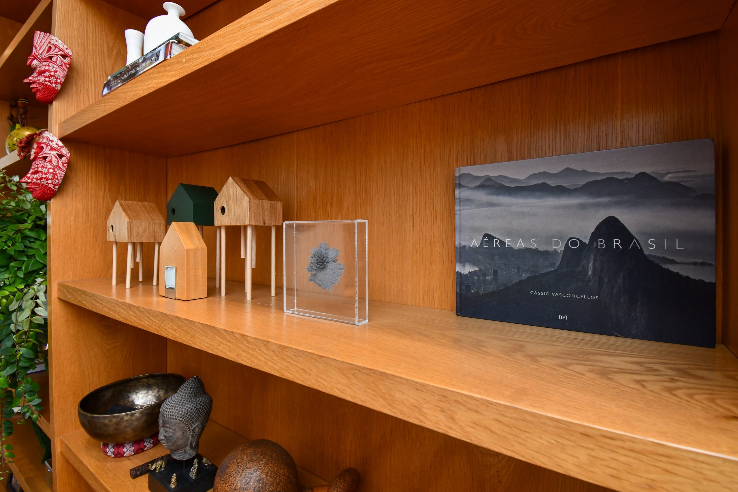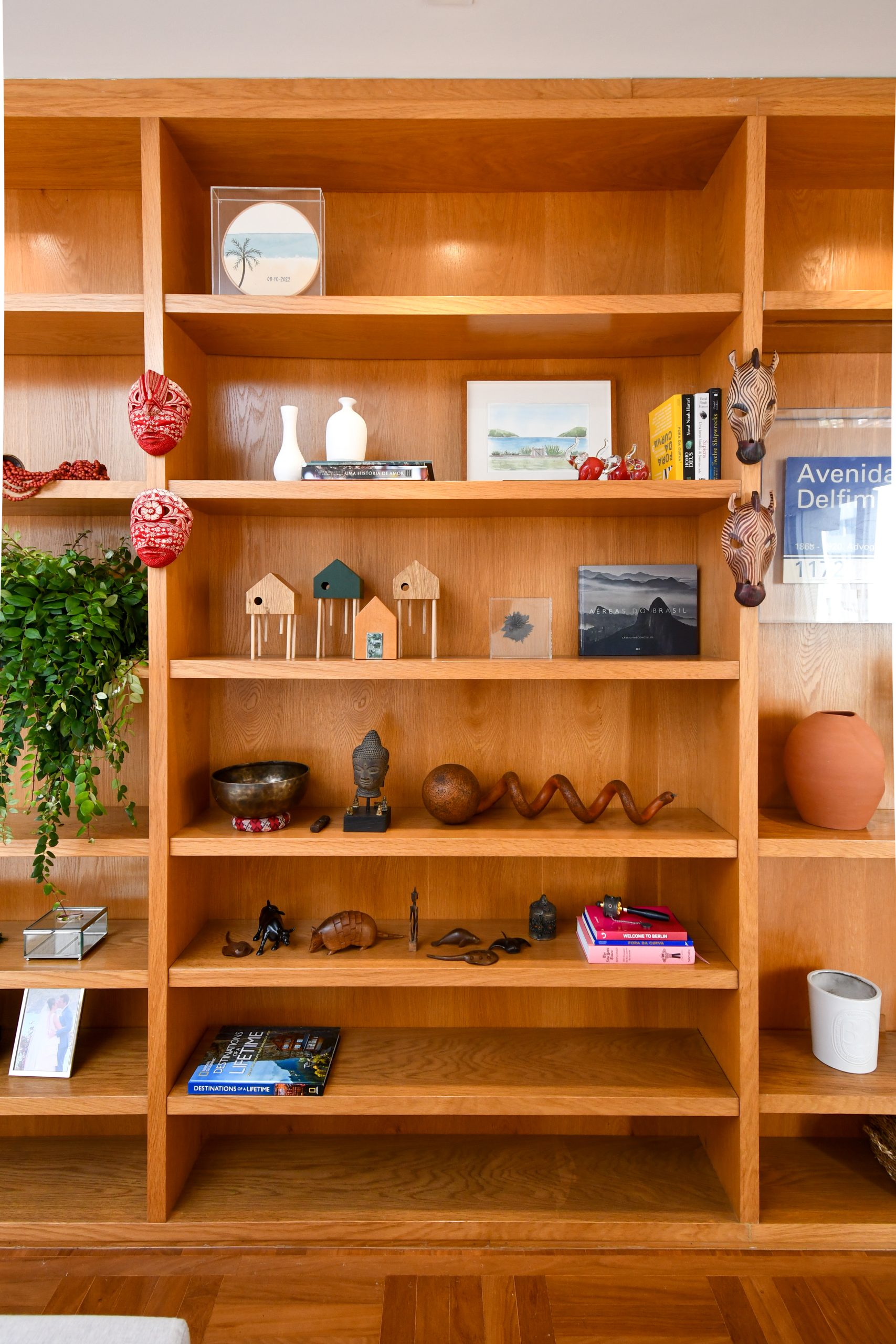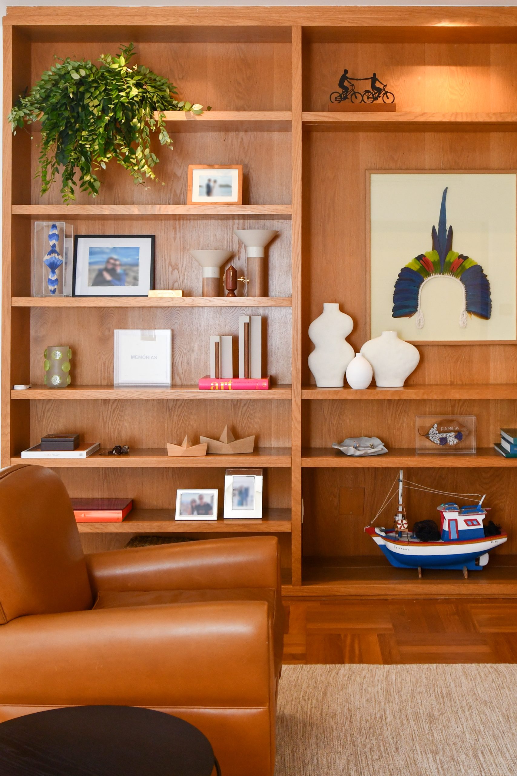A arquitetura original do apartamento já trazia elementos marcantes, como a estante de marcenaria em madeira caramelo que percorre toda a parede principal — estrutura que serviu de ponto de partida para o novo olhar do projeto. A missão do escritório foi revelar o potencial desse elemento existente, transformando o espaço a partir de uma curadoria sensível de mobiliário, arte e objetos soltos. Cada peça foi escolhida com precisão, em diálogo entre o olhar do escritório e o dos moradores, resultando em uma composição que é ao mesmo tempo pessoal e harmônica.