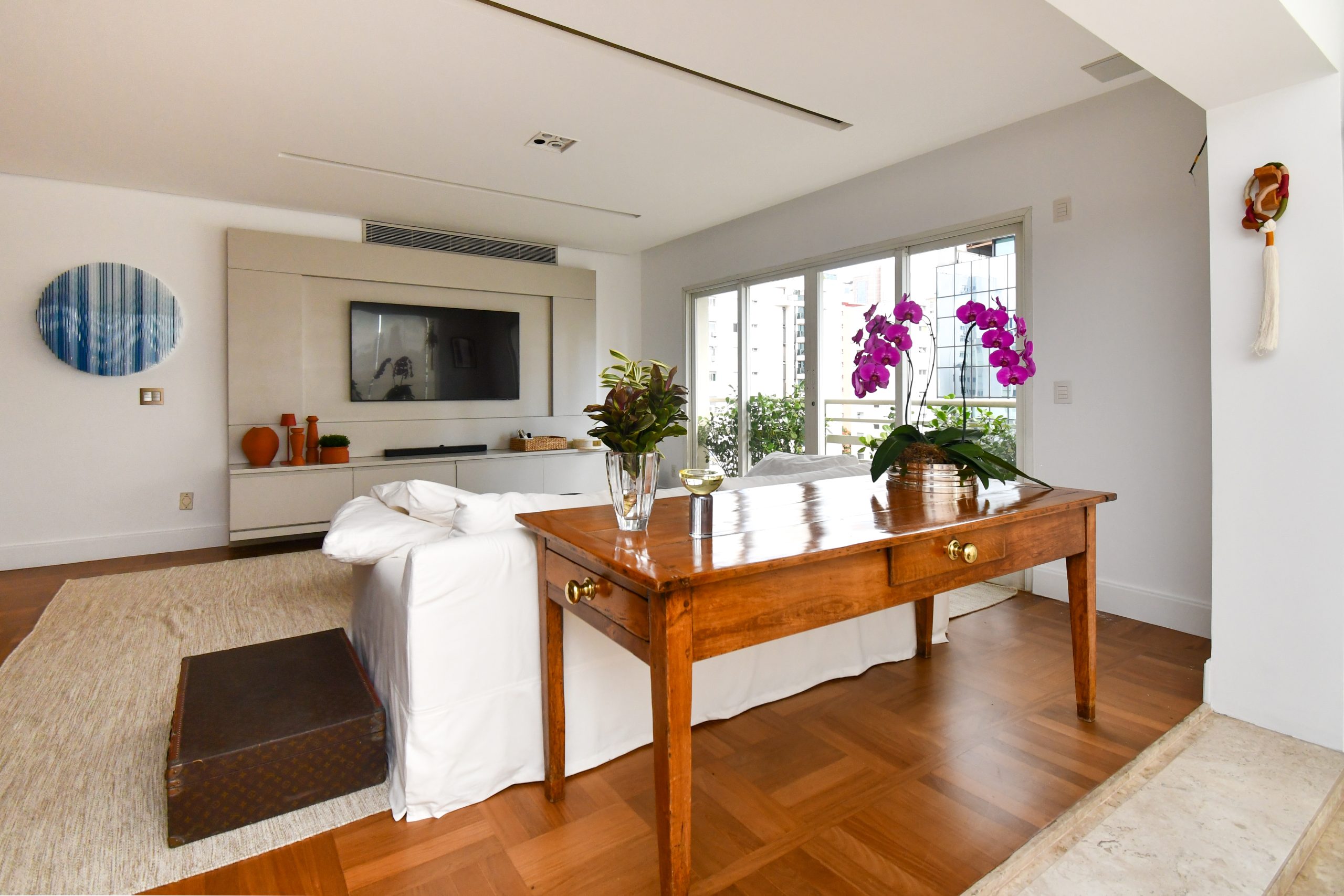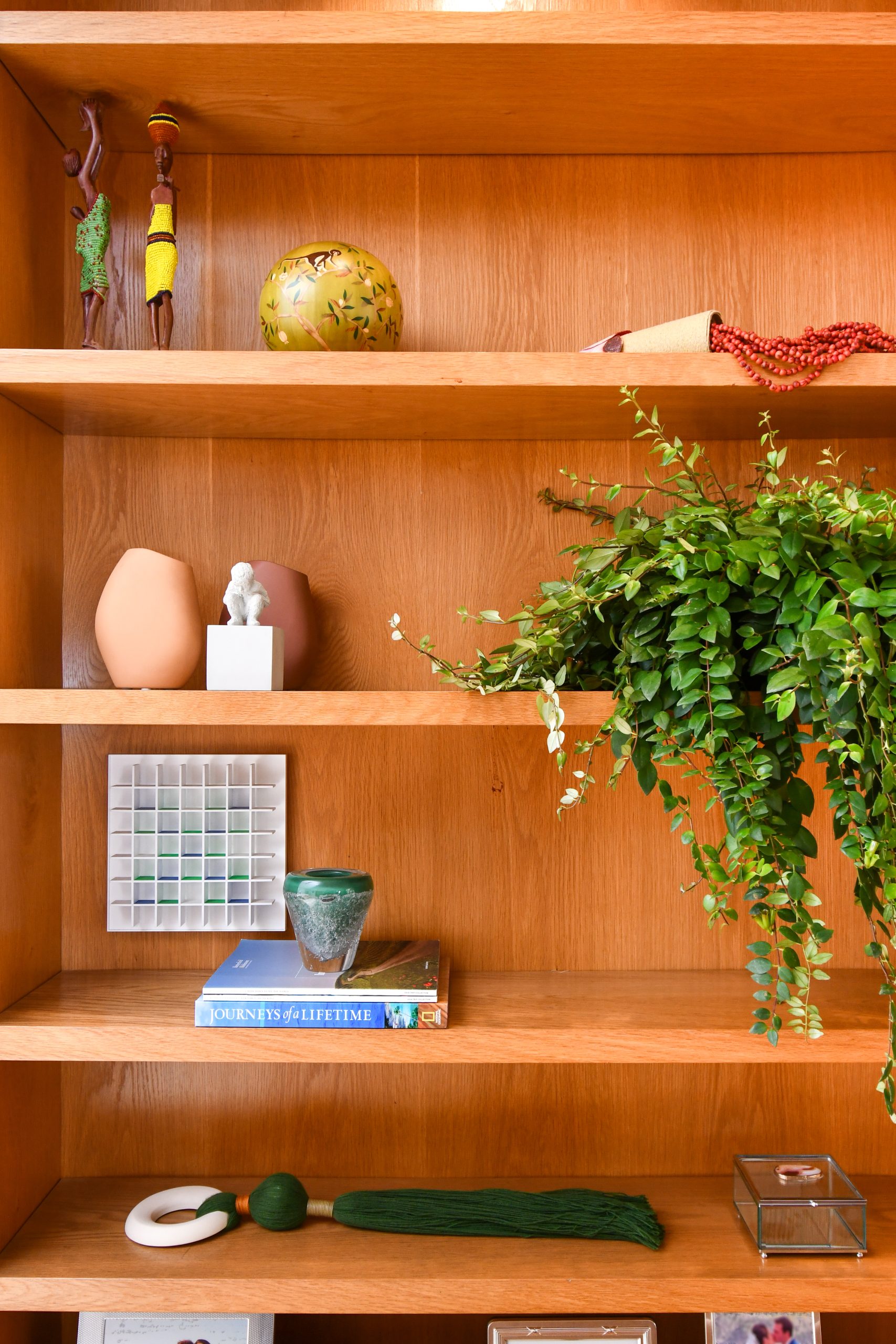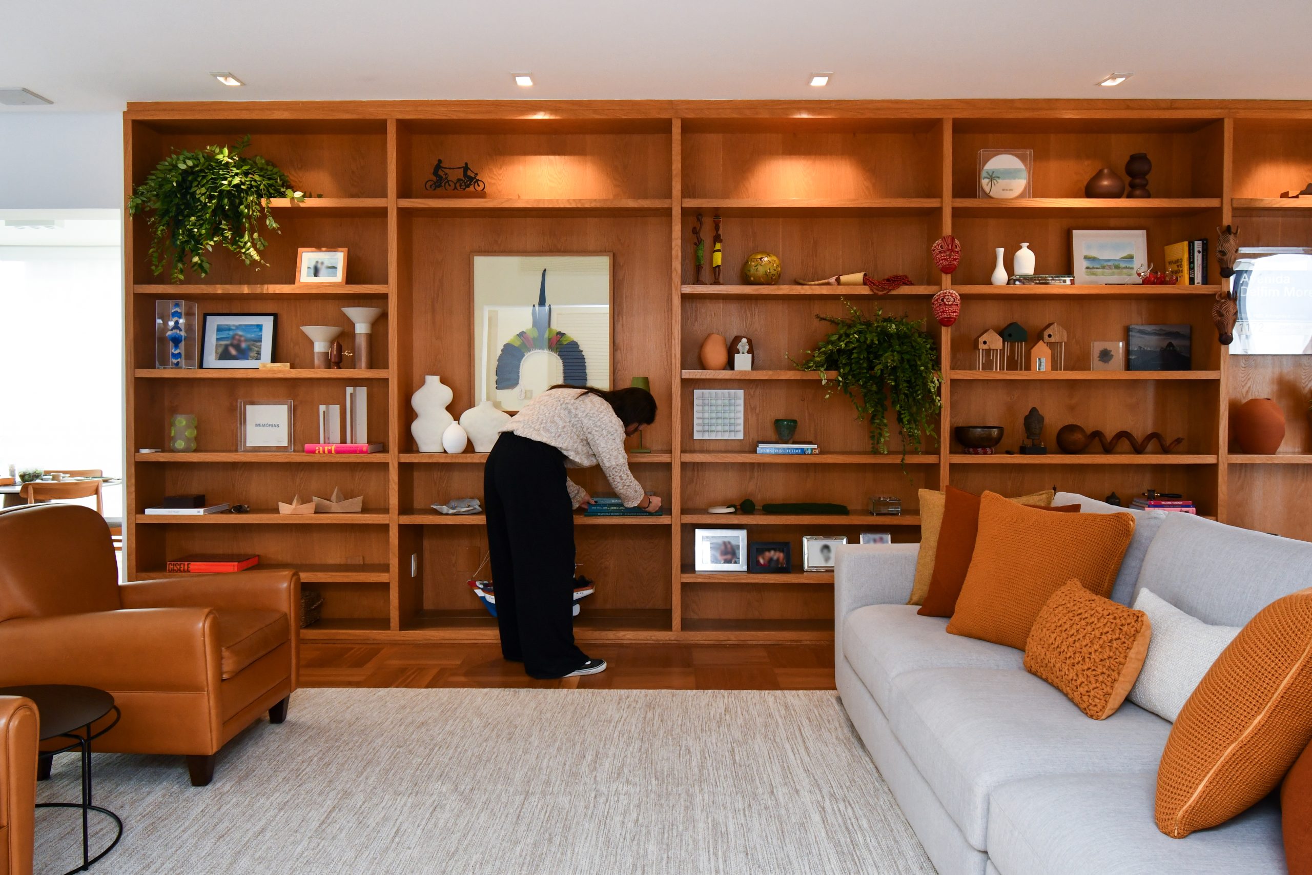 A arquitetura original do apartamento já trazia elementos marcantes, como a estante de marcenaria em madeira caramelo que percorre toda a parede principal — estrutura que serviu de ponto de partida para o novo olhar do projeto. A missão do escritório foi revelar o potencial desse elemento existente, transformando o espaço a partir de uma curadoria sensível de mobiliário, arte e objetos soltos. Cada peça foi escolhida com precisão, em diálogo entre o olhar do escritório e o dos moradores, resultando em uma composição que é ao mesmo tempo pessoal e harmônica.