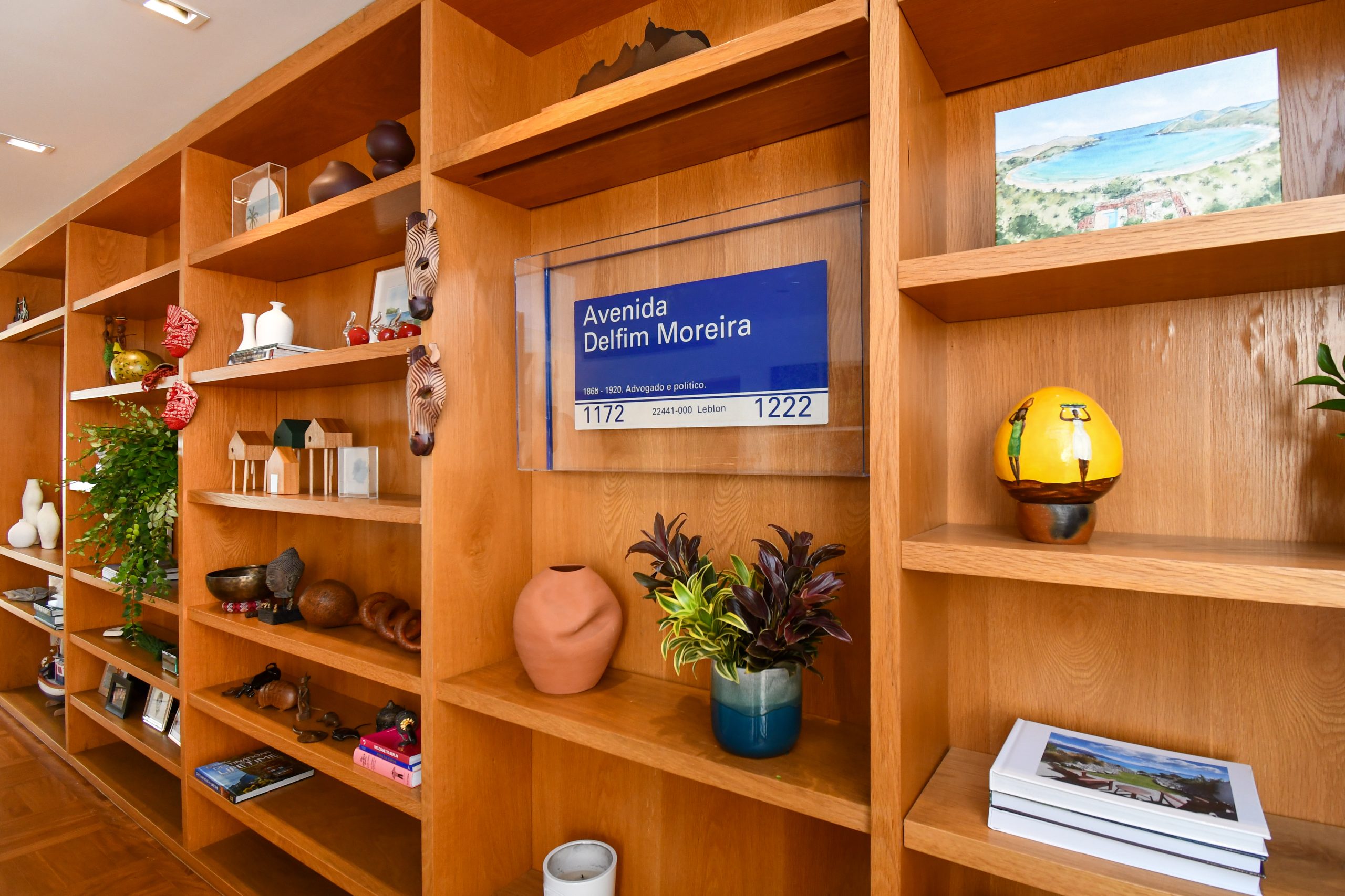 Cada objeto carrega uma memória, uma lembrança viva. Há souvenirs que vieram de longe, peças herdadas da família e relíquias afetivas que contam mais do que o tempo: contam pertencimento. Um exemplo emblemático é a placa original da Avenida Delfim Moreira, no Leblon — uma homenagem ao Rio de Janeiro e às raízes do morador carioca.