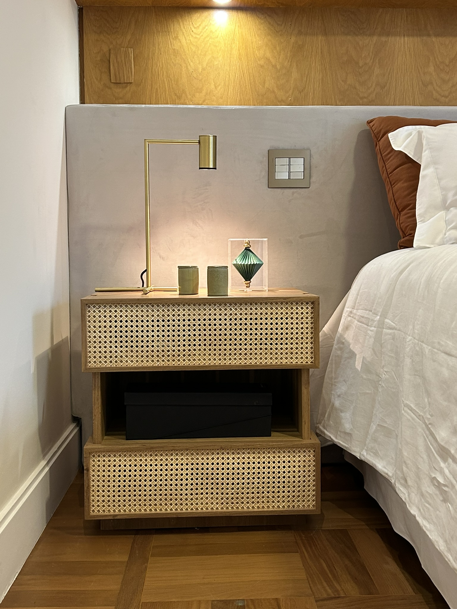 Nos ambientes íntimos, o tom muda sutilmente. A suíte principal – outro espaço que sofreu intervenção – ganha uma paleta de tons quentes e materiais naturais, que reforçam a sensação de abrigo. A nova cabeceira em tecido aveludado cinza em harmonia com o painel de marcenaria existente, em conjunto com as novas mesinhas de cabeceira em madeira clara e palhinha natural, conversam bem com o enxoval em tons terrosos e o banco que foi repaginado, ganhando um novo tecido listrado da Entreposto. Tecidos de textura macia, madeira e fibras compõem um cenário que é tanto urbano quanto sensorial — um refúgio para desacelerar.