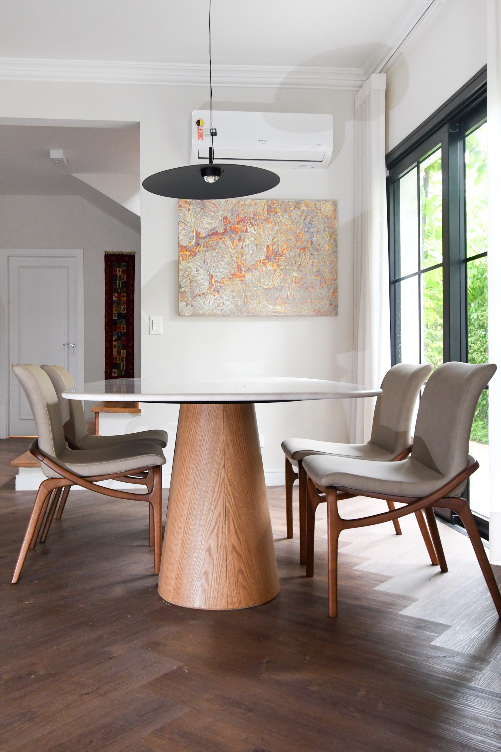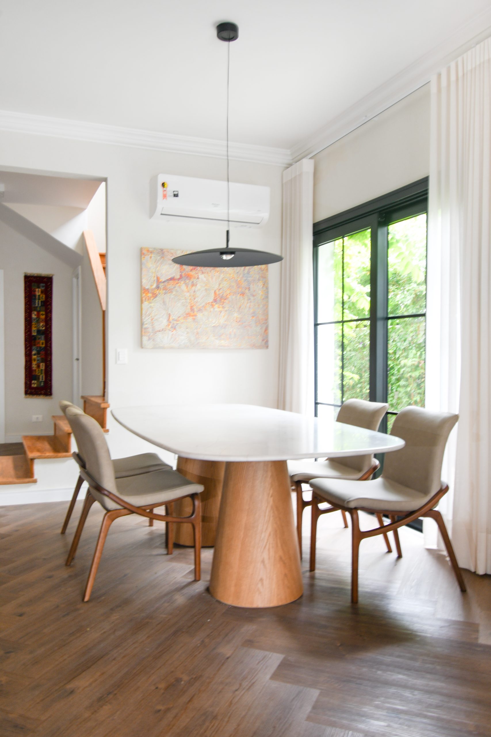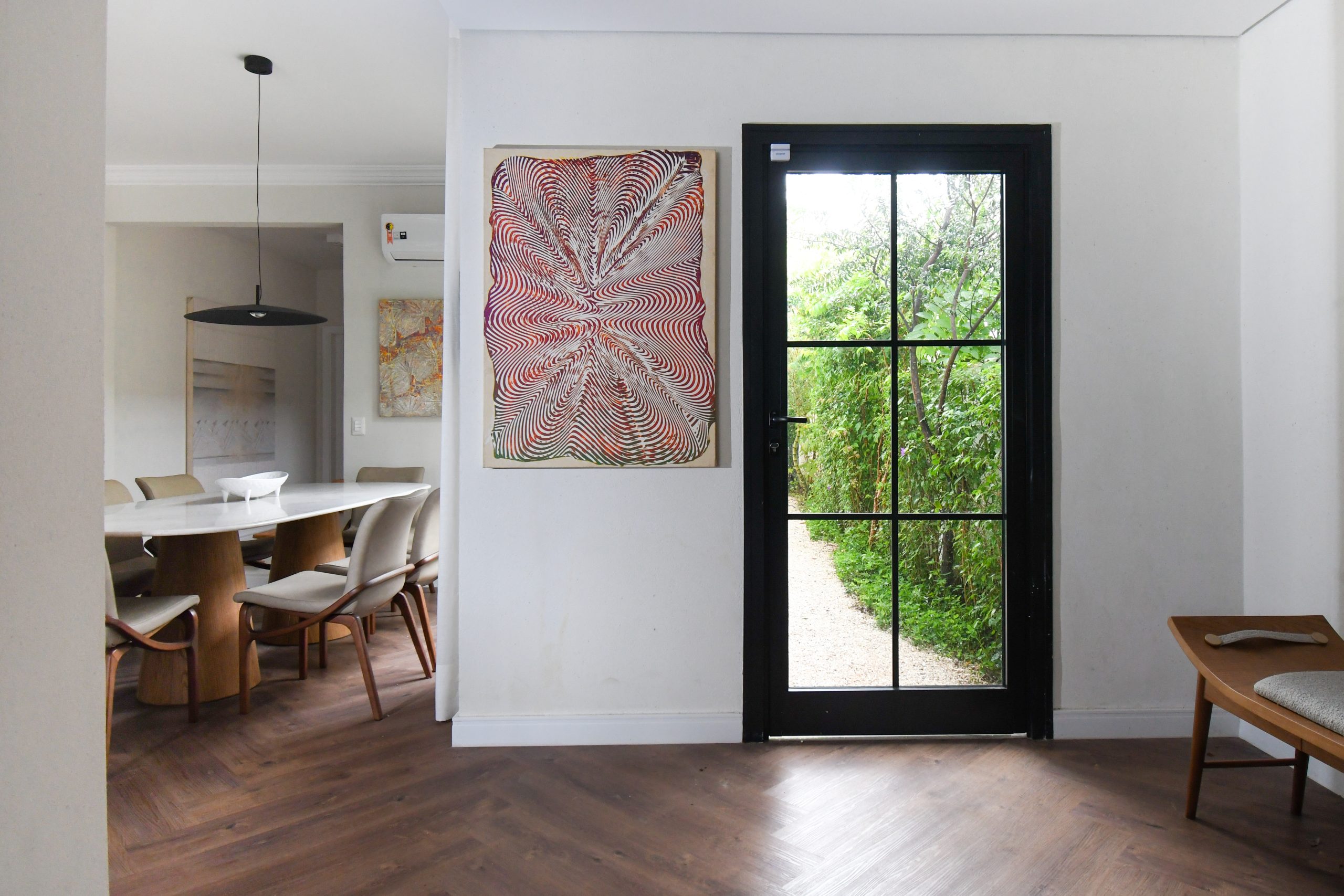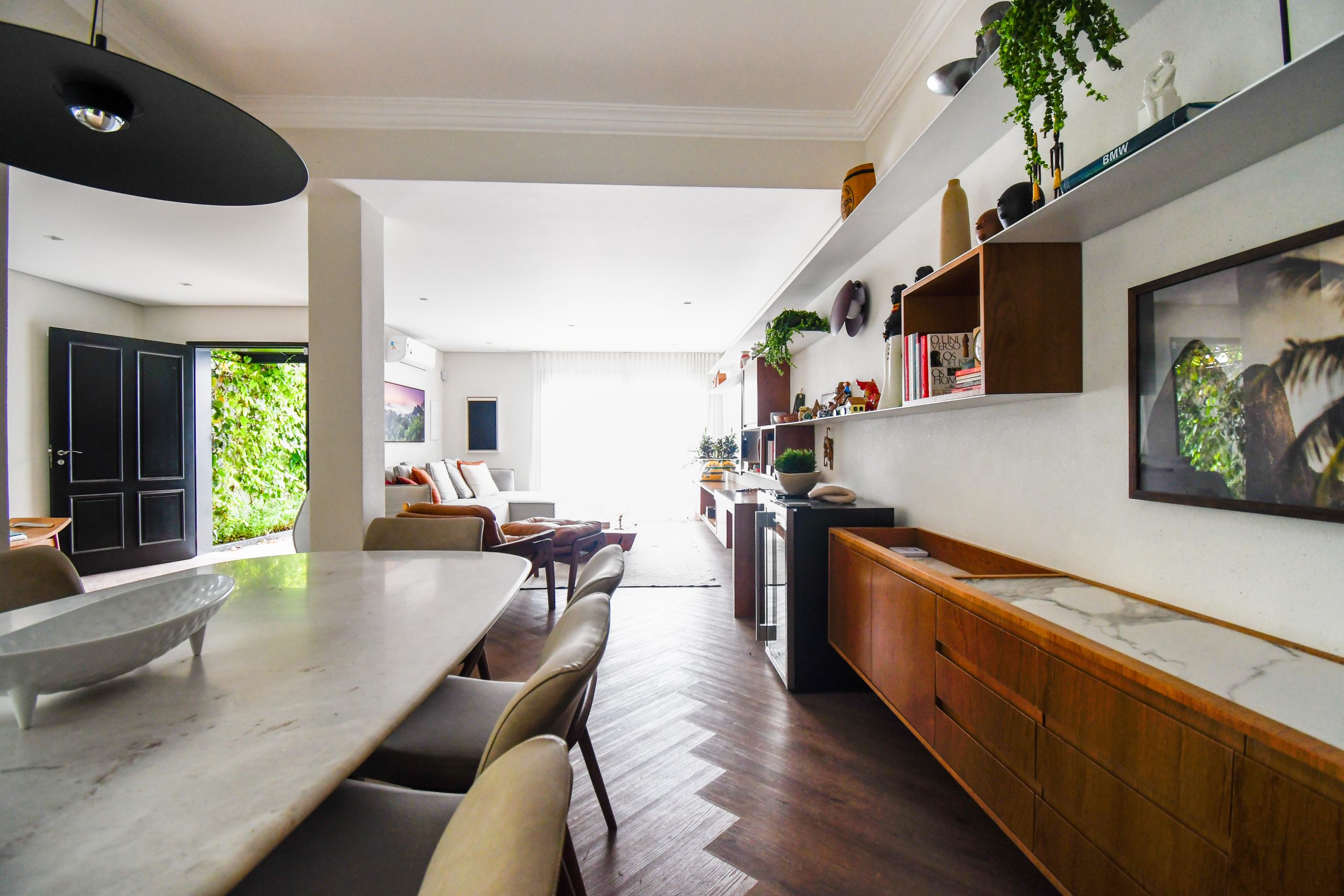 O interior da casa foi pensado para dissolver os limites entre dentro e fora com materiais naturais, tons neutros e obras de arte que dialogam com o verde ao redor. Na cozinha, a luz natural é protagonista: o piso original de granilite foi preservado e contrasta com a marcenaria em tom de cinza claro e pendentes minimalistas que contrastam com a madeira natural nas banquetas do Aristeu Pires.