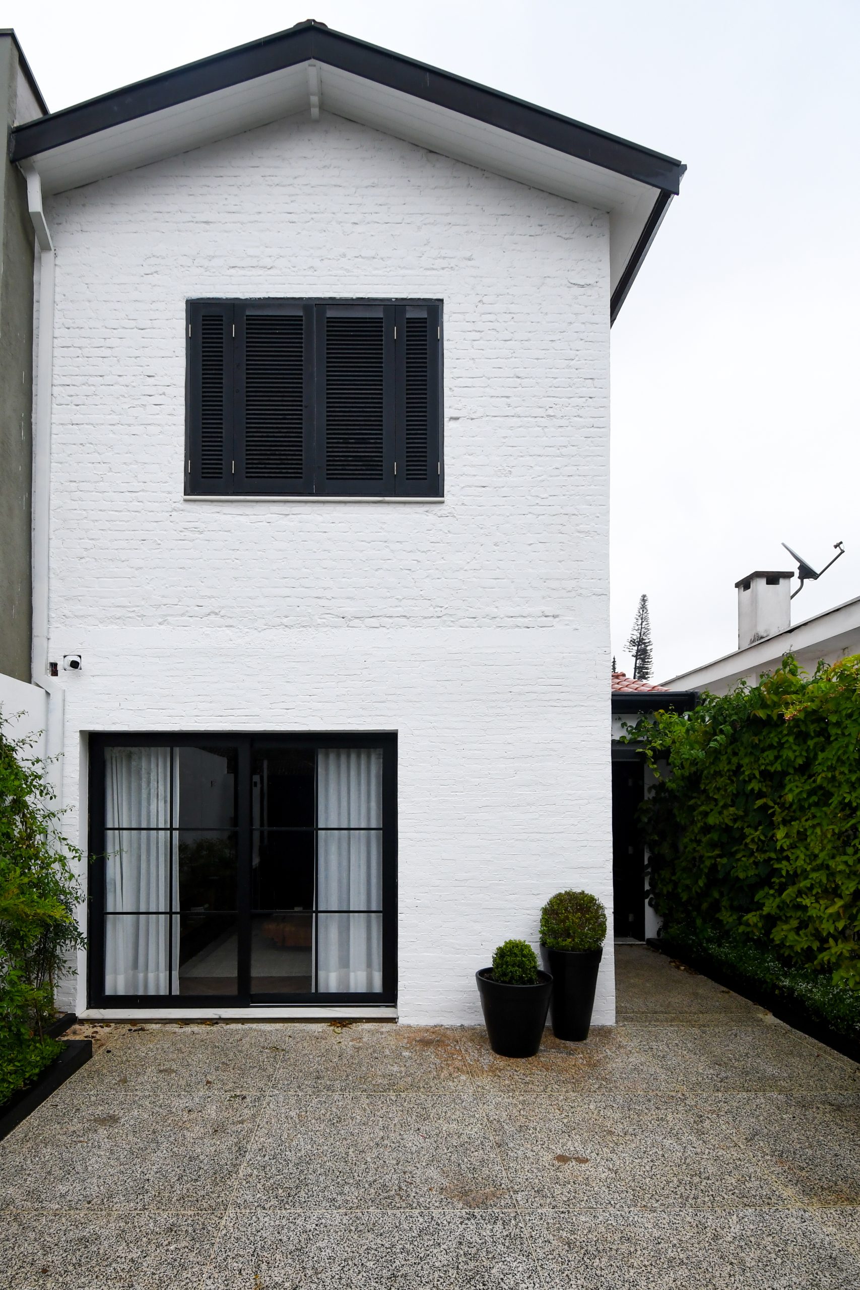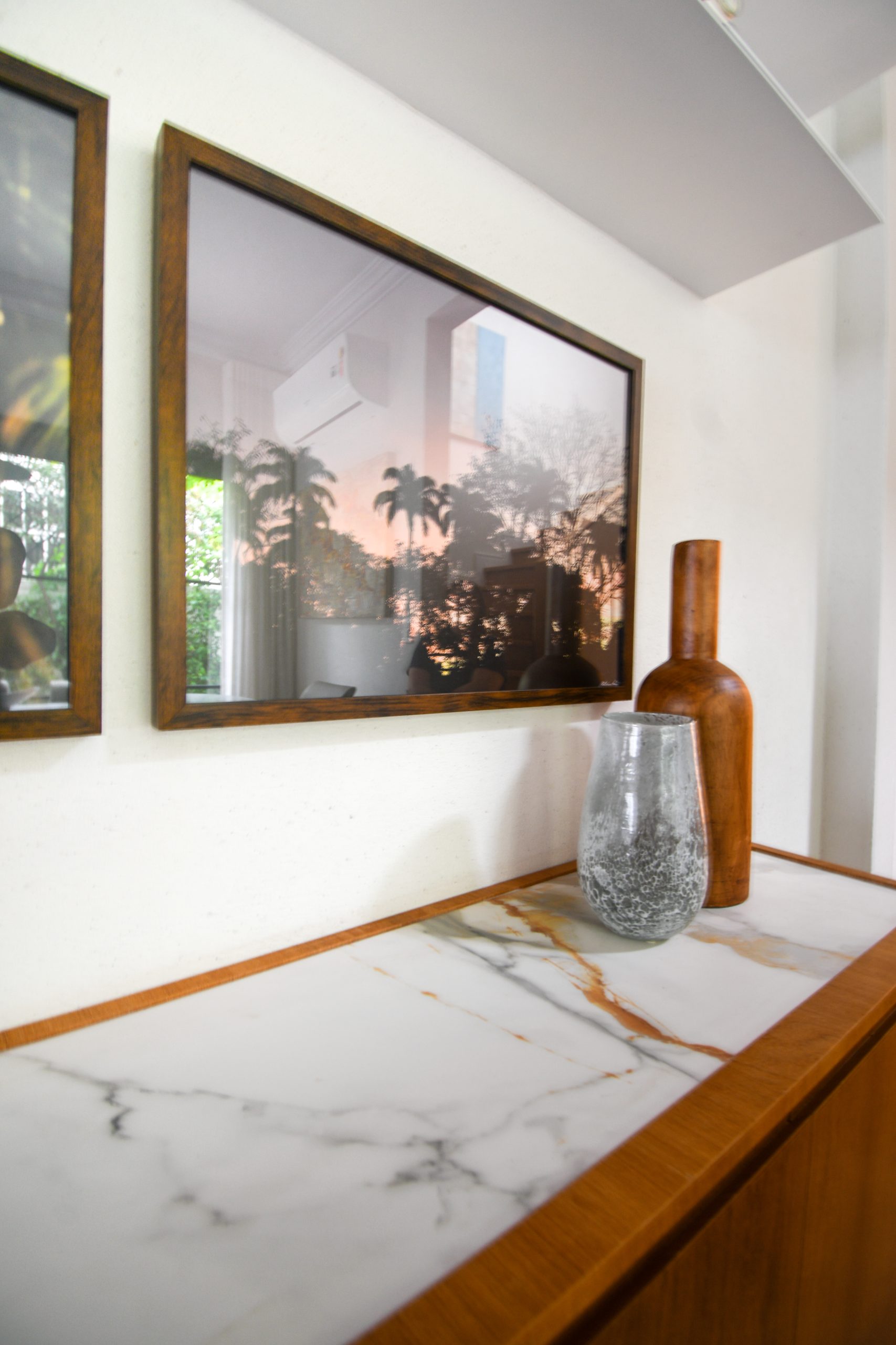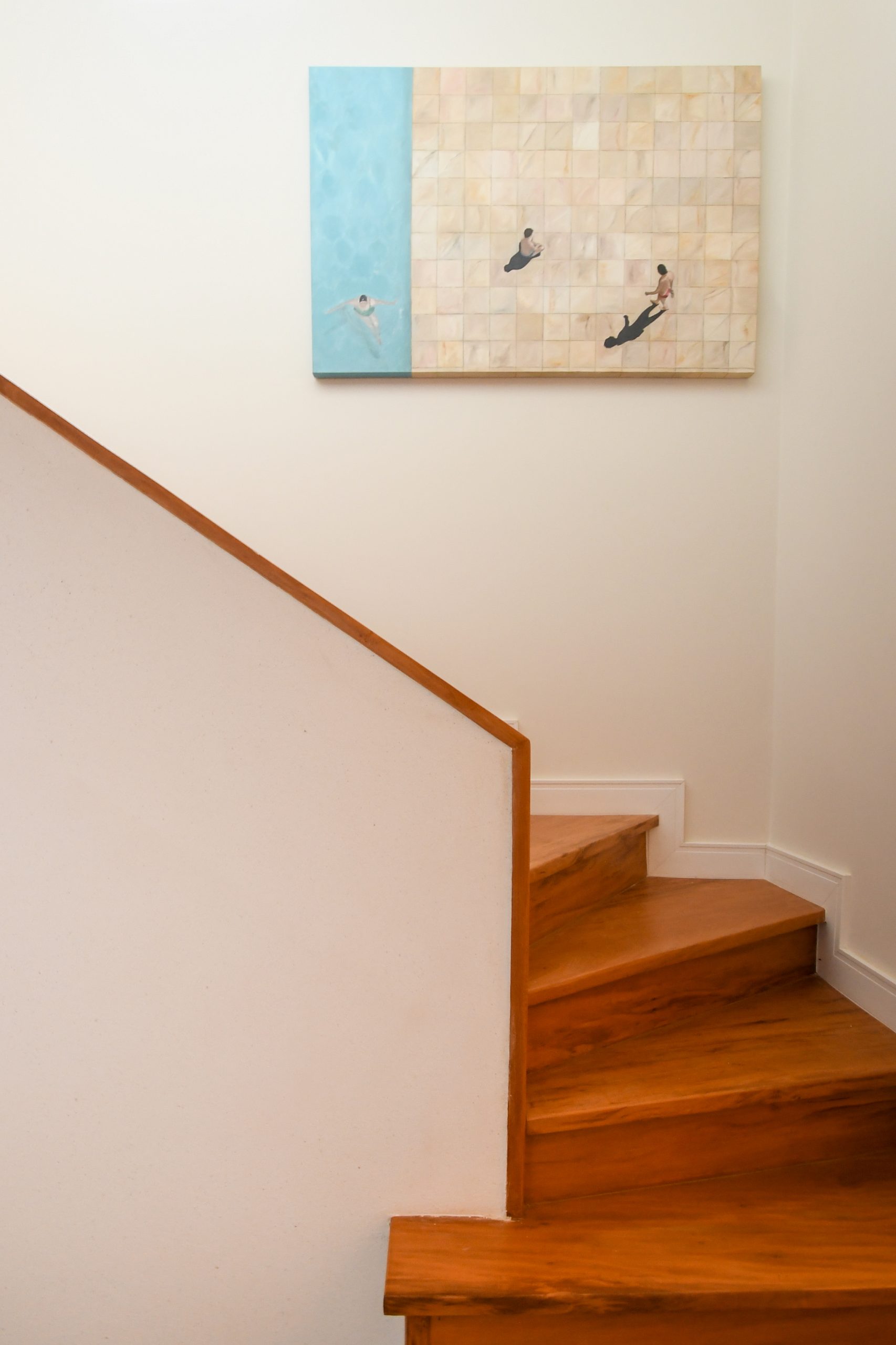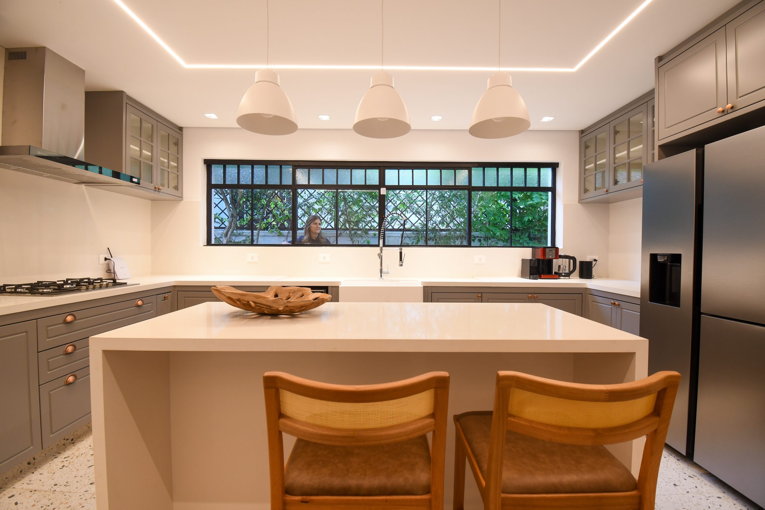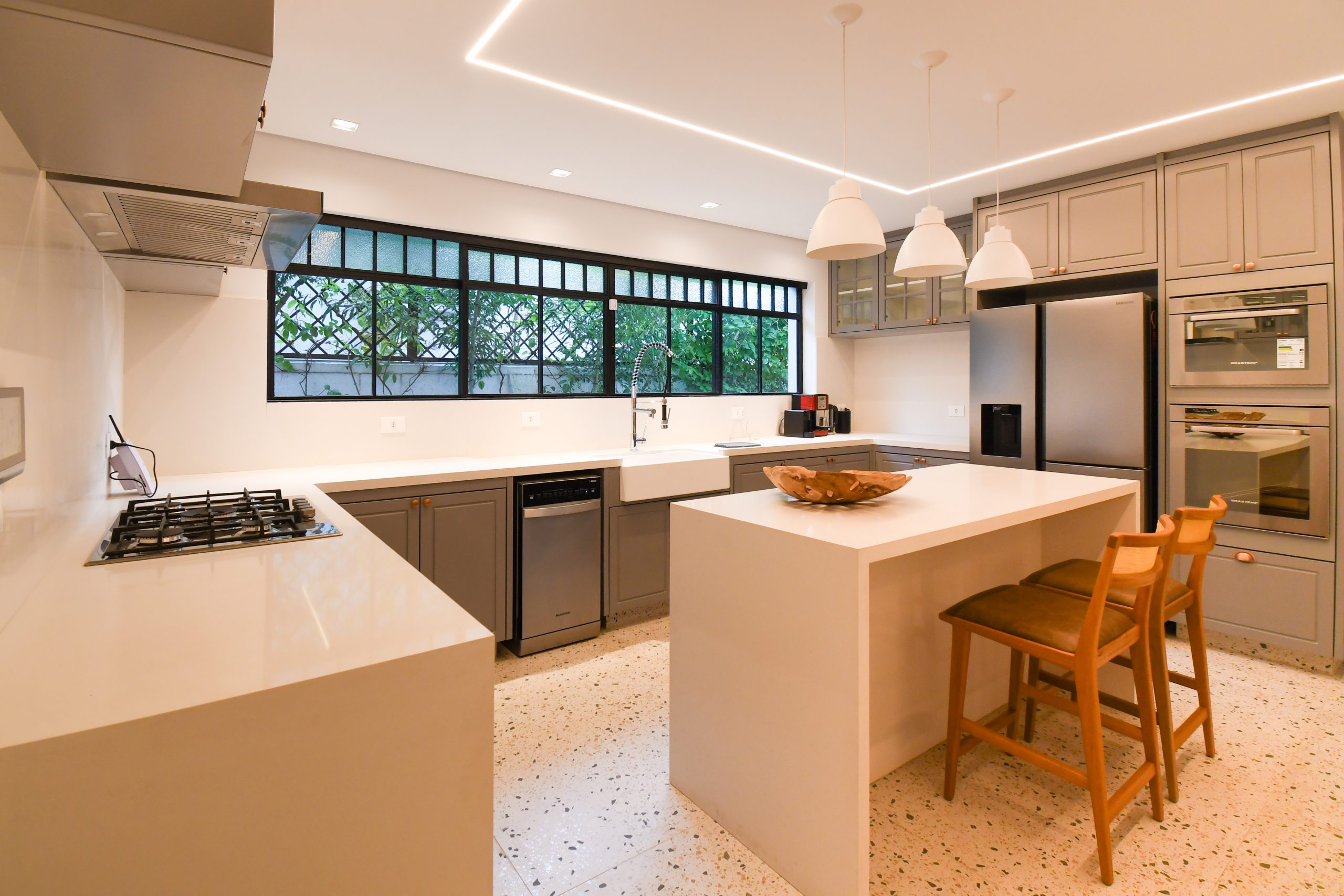 O interior da casa foi pensado para dissolver os limites entre dentro e fora com materiais naturais, tons neutros e obras de arte que dialogam com o verde ao redor. Na cozinha, a luz natural é protagonista: o piso original de granilite foi preservado e contrasta com a marcenaria em tom de cinza claro e pendentes minimalistas que contrastam com a madeira natural nas banquetas do Aristeu Pires.