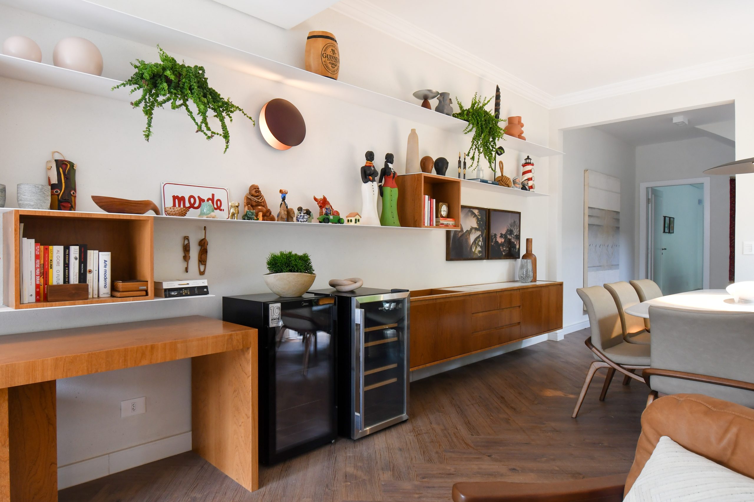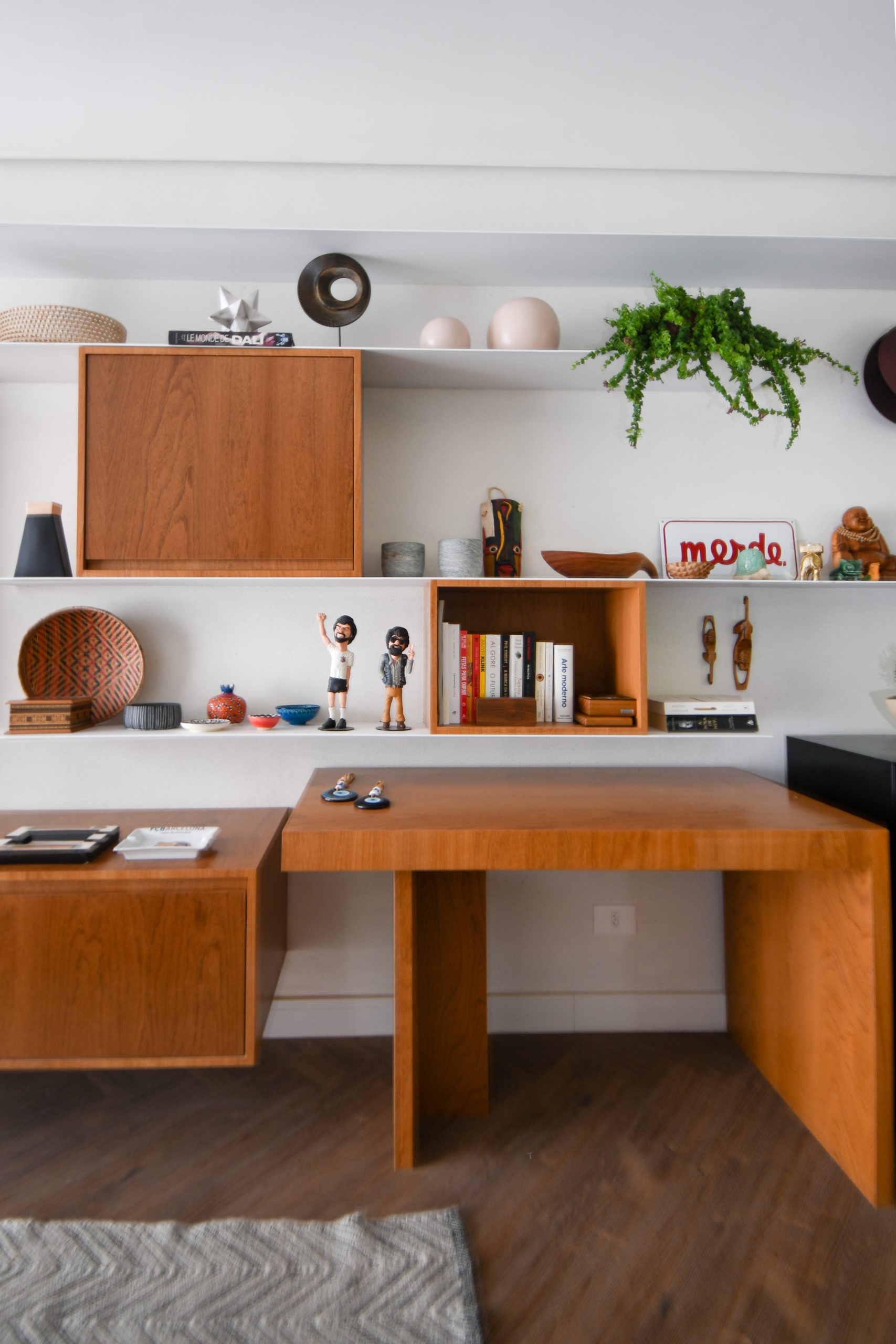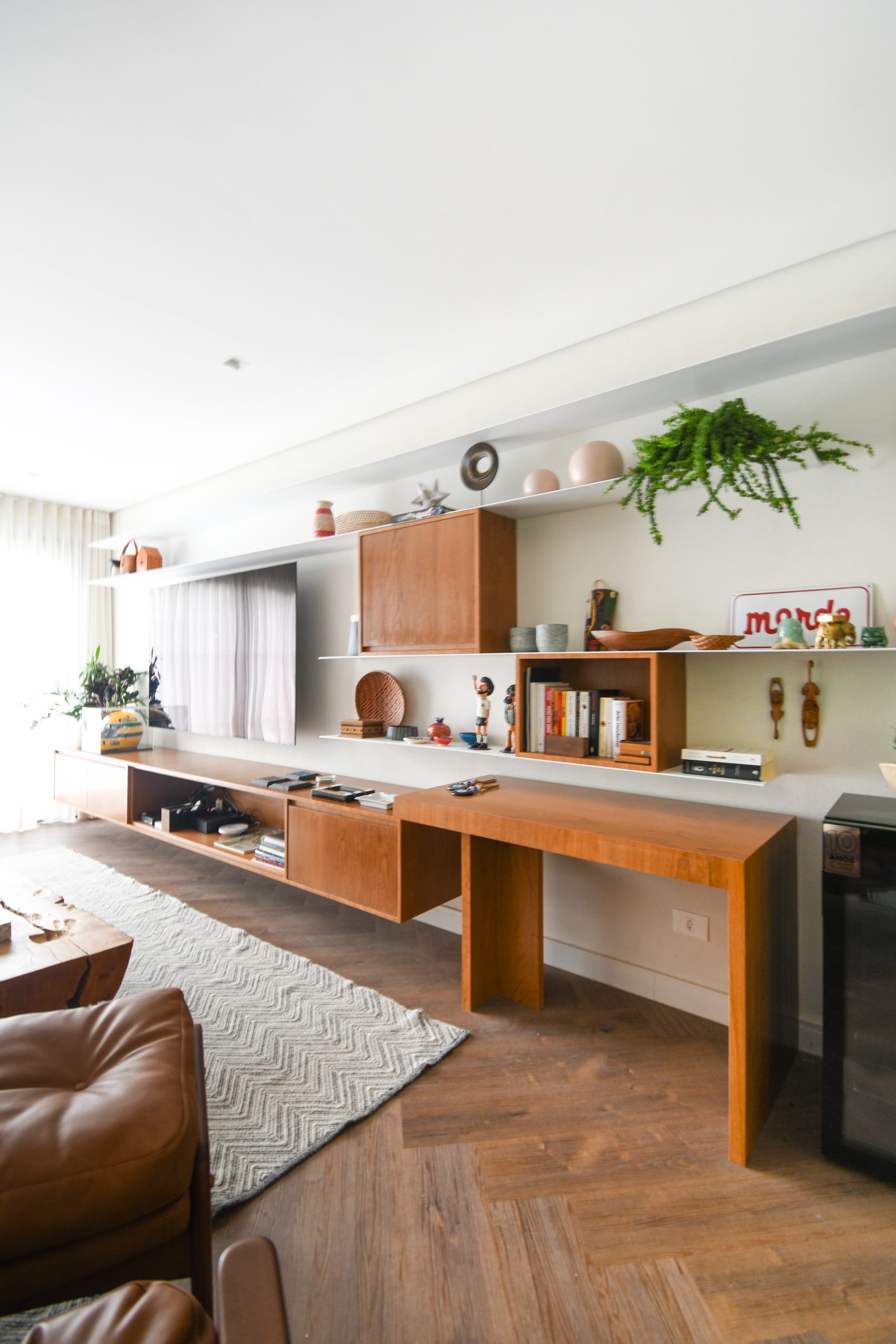 Na sala, as grandes prateleiras em aço branco que atravessam o ambiente junto ao desenho da marcenaria em madeira goiabão claro, se transformam em um suporte para histórias: nelas se acomodam objetos, livros e lembranças de viagens, compondo um retrato sensível de quem vive ali.