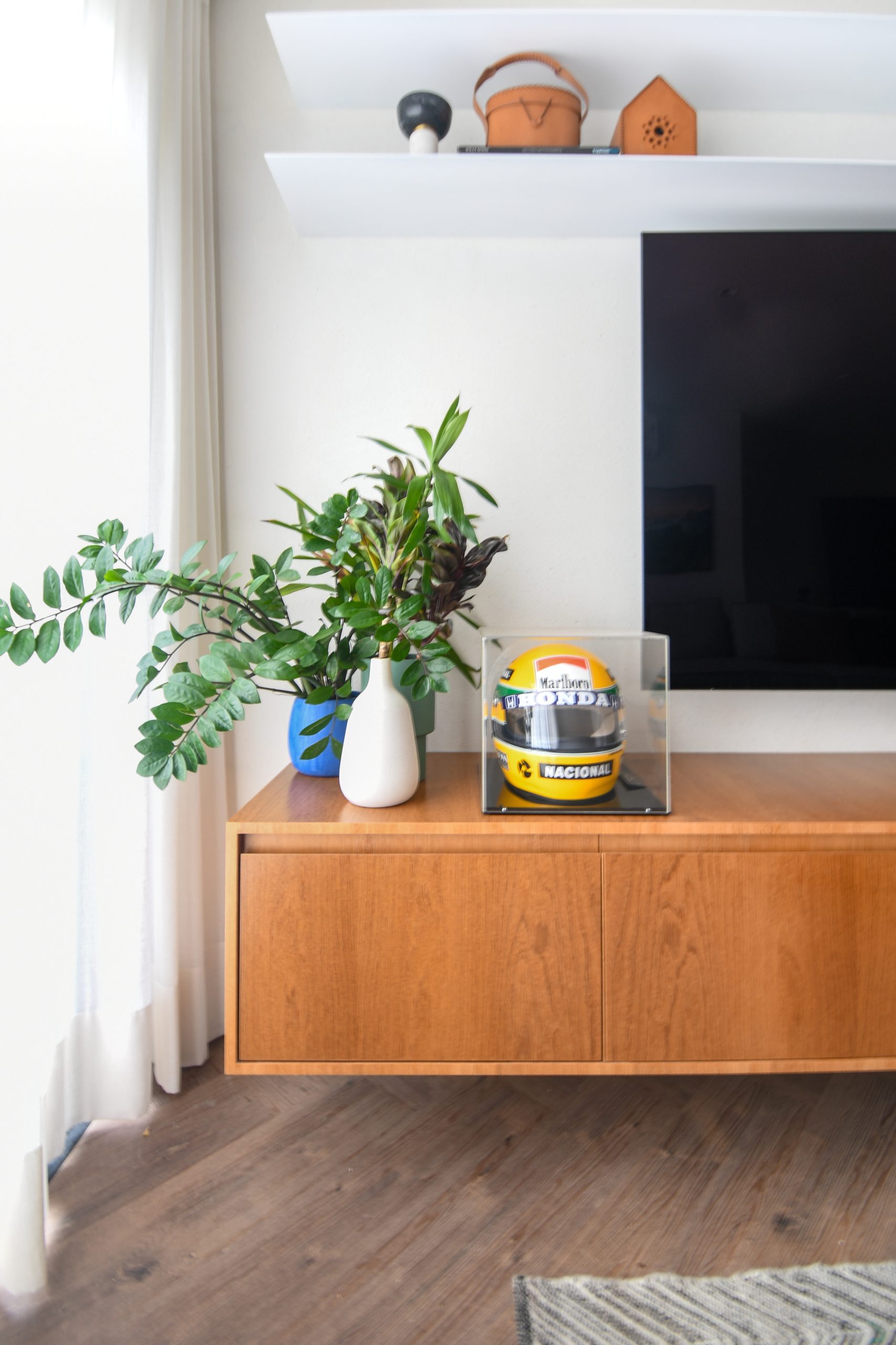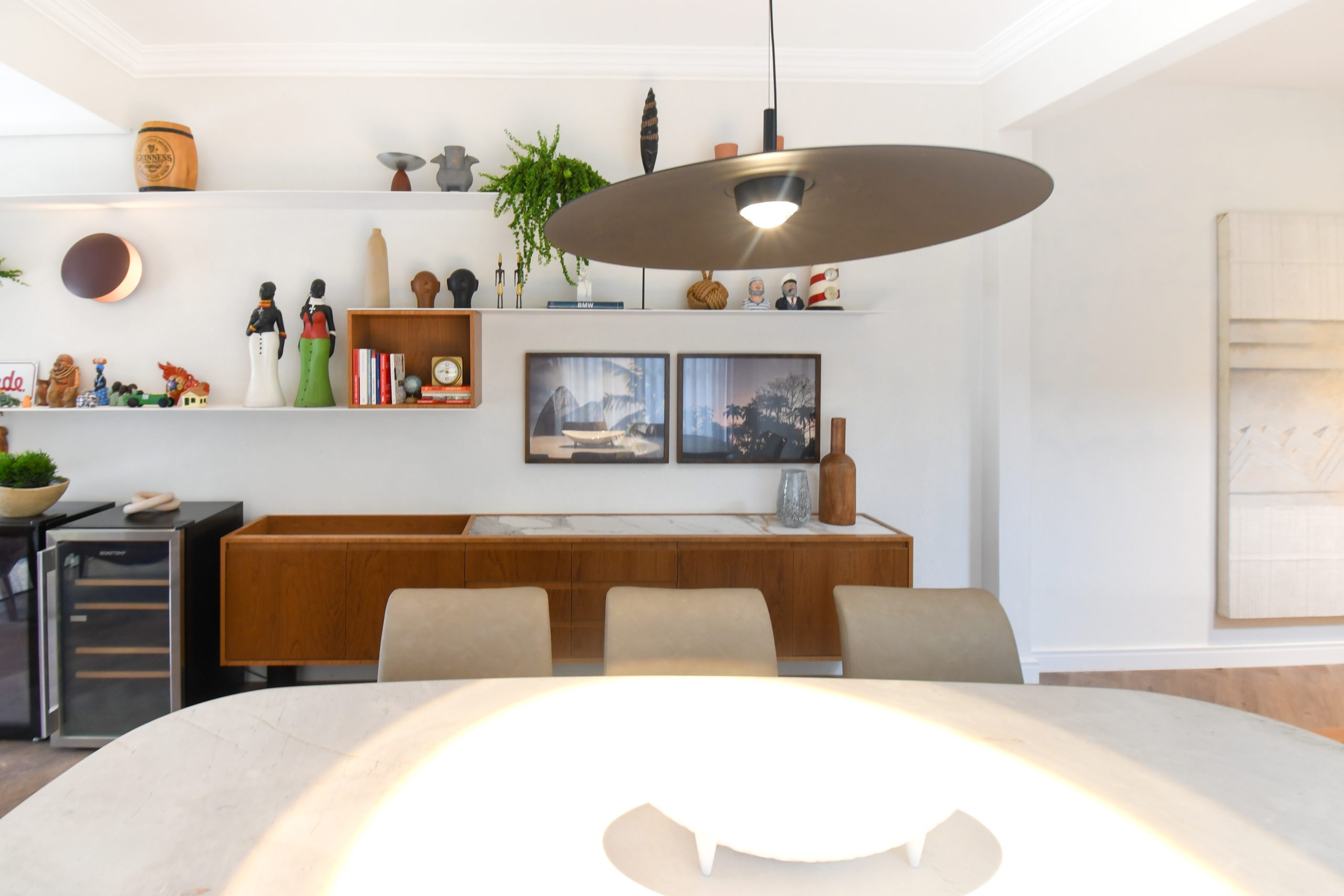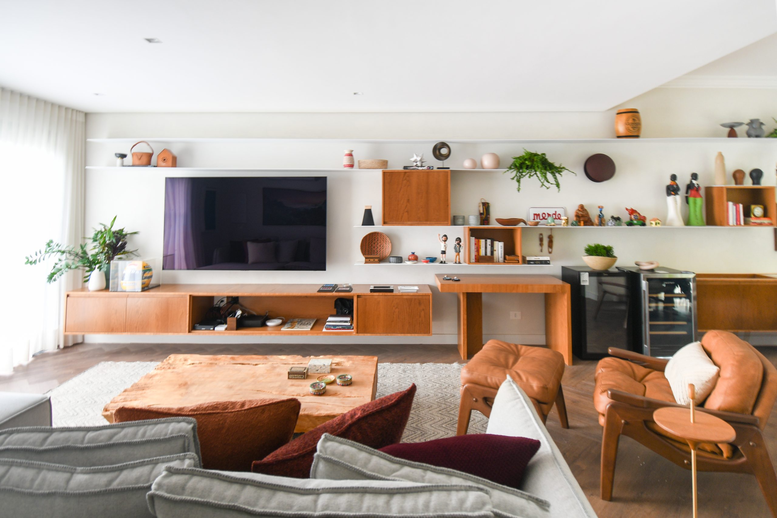 Na sala, as grandes prateleiras em aço branco que atravessam o ambiente junto ao desenho da marcenaria em madeira goiabão claro, se transformam em um suporte para histórias: nelas se acomodam objetos, livros e lembranças de viagens, compondo um retrato sensível de quem vive ali.