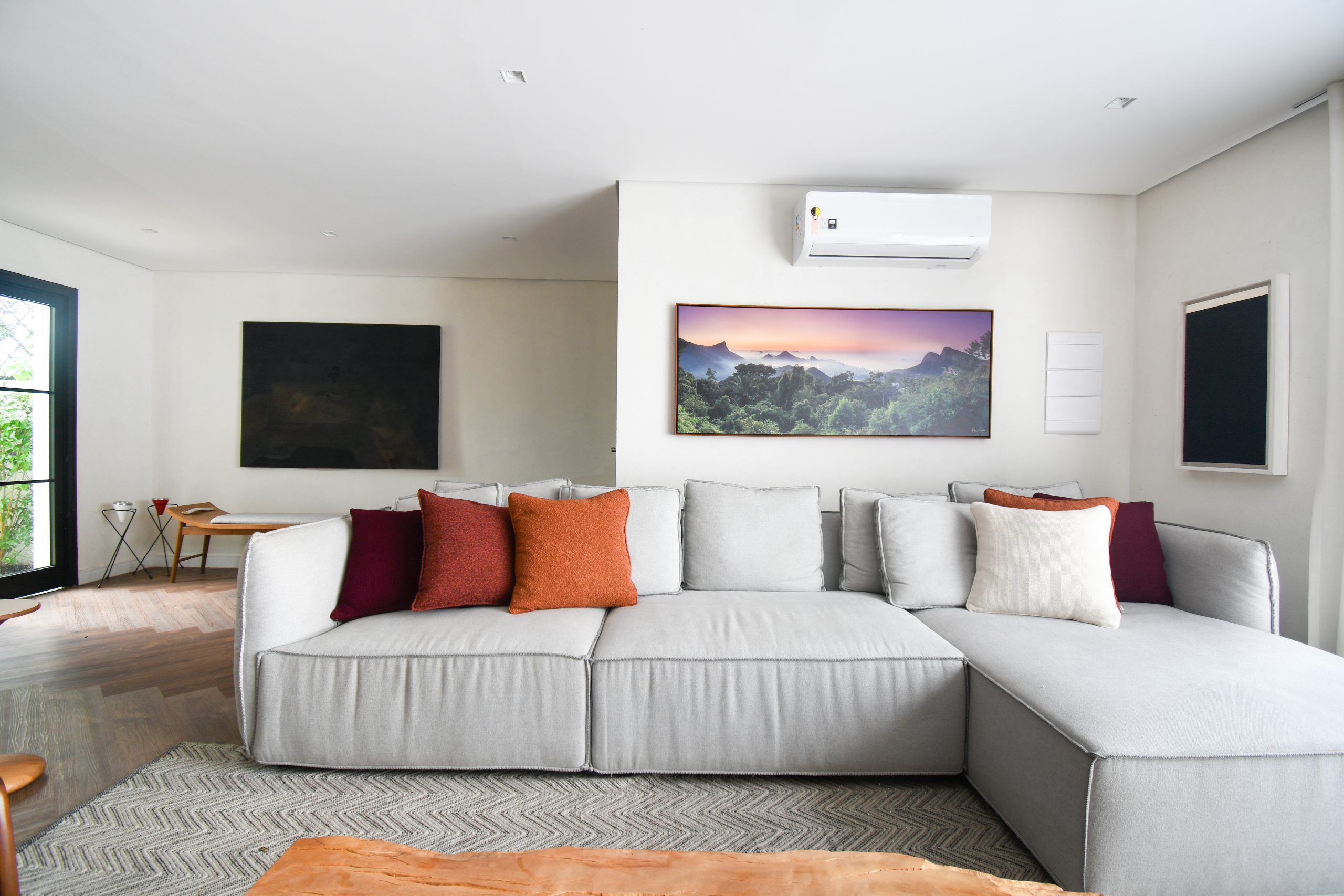 O grande sofá cinza do Estúdio Bola garante o conforto da sala enquanto os mobiliários soltos da Illustre Móveis compõem com leveza o ambiente.
