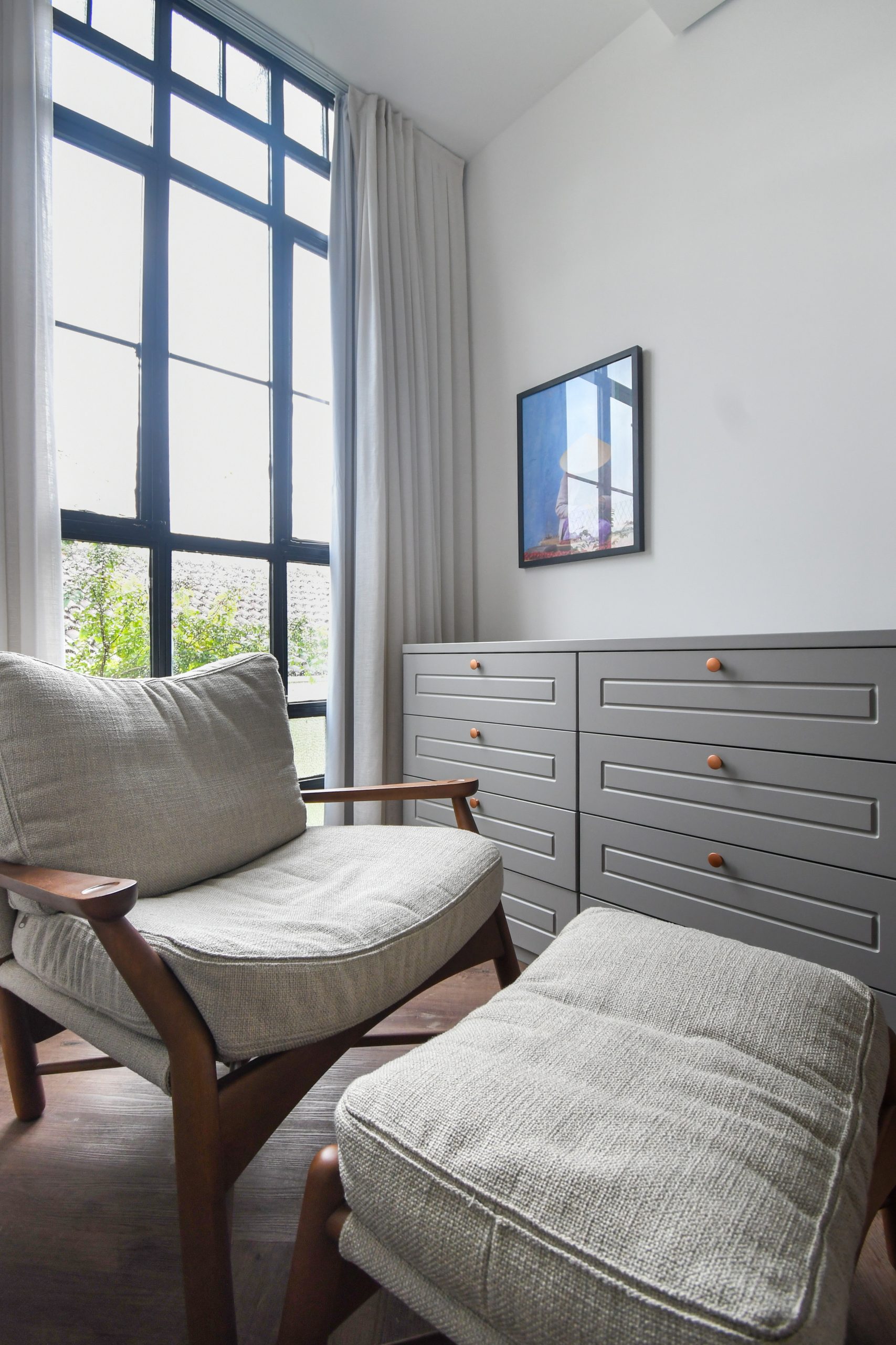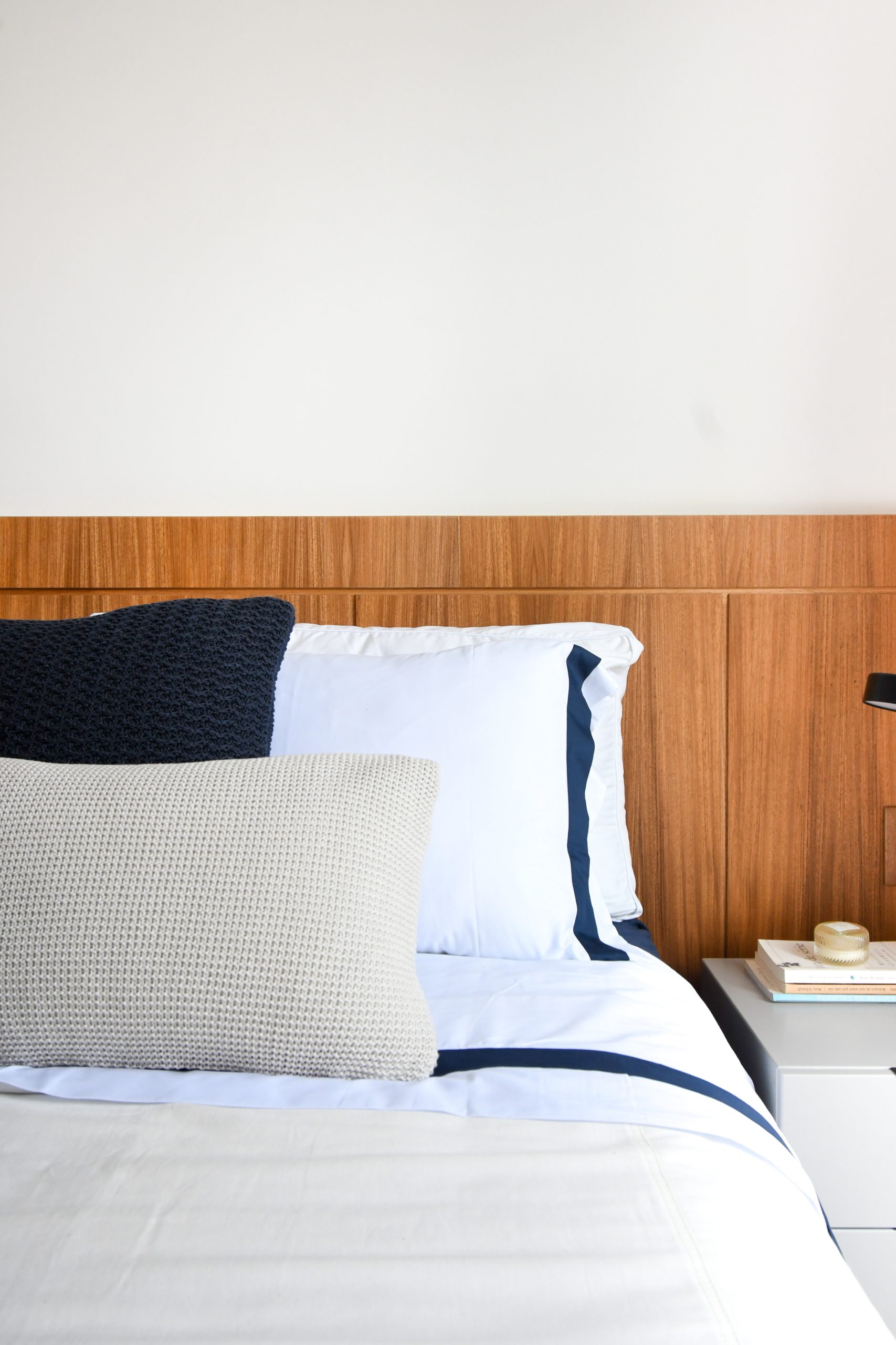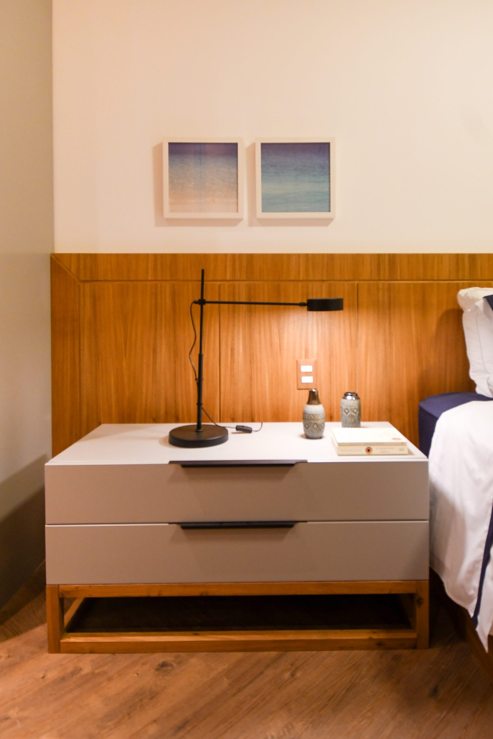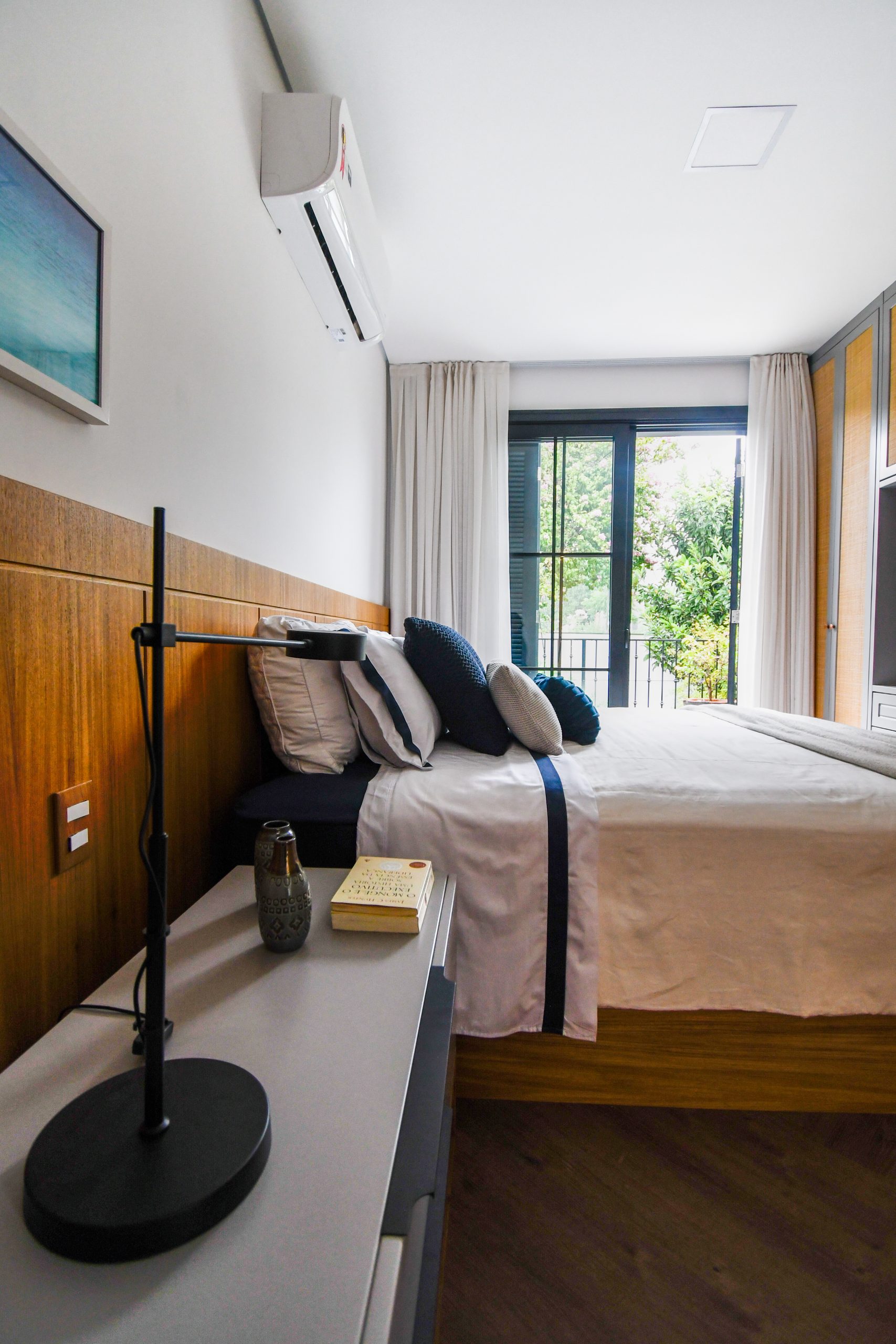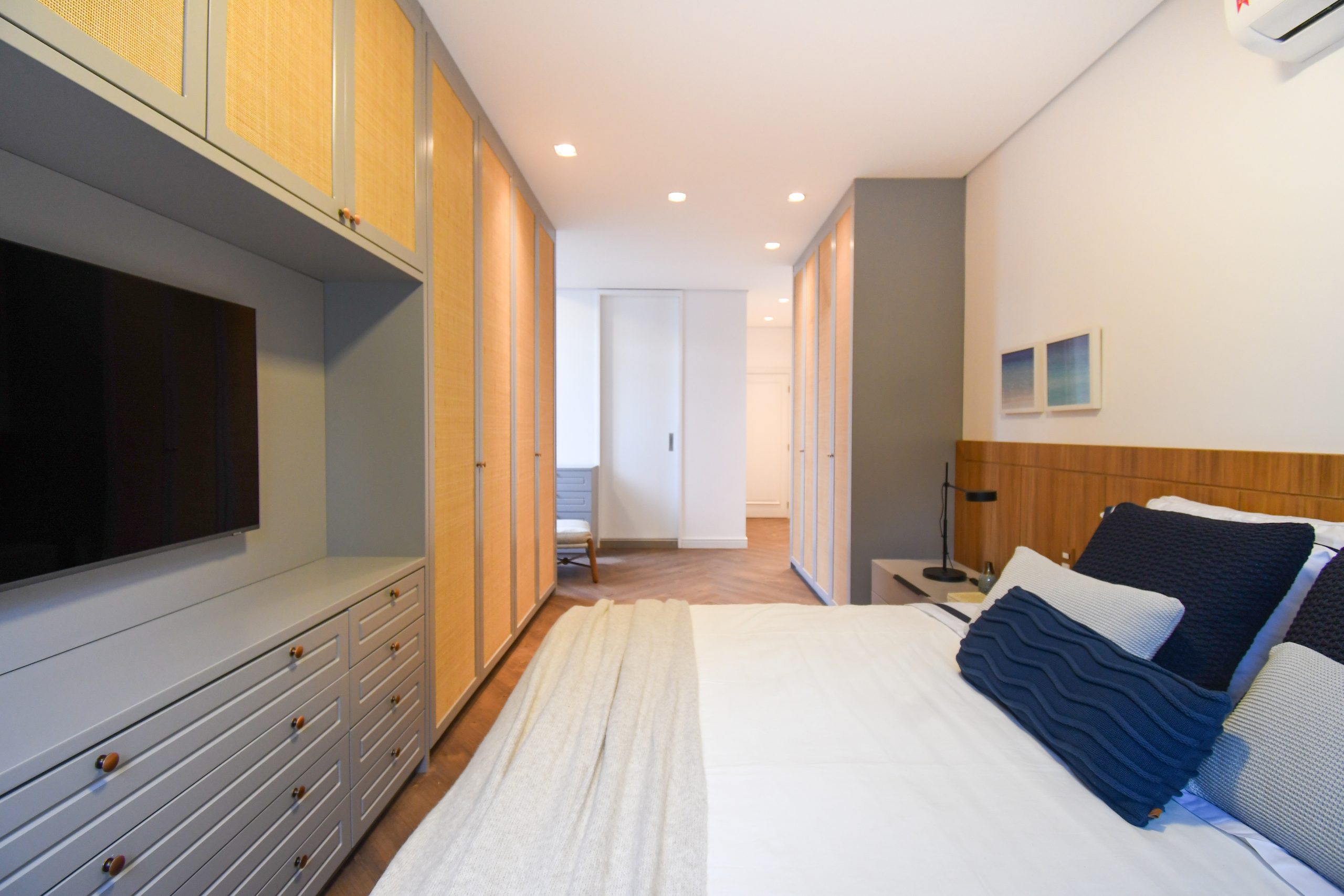 No dormitório, parte dos armários foi aberta para alongar o ambiente e ampliar a entrada de luz. Buscando criar um ambiente aconchegante, trouxemos pontos de cor suaves através do jogo de cama azul marinho da Linea Home que faz composição junto as almofadas em tricô da Codex. A marcenaria dos armários marcada em tom cinza claro contrasta a madeira freijó presente na cabeceira aquecendo o ambiente enquanto cortinas em linho com blackout garantem o conforto preciso.