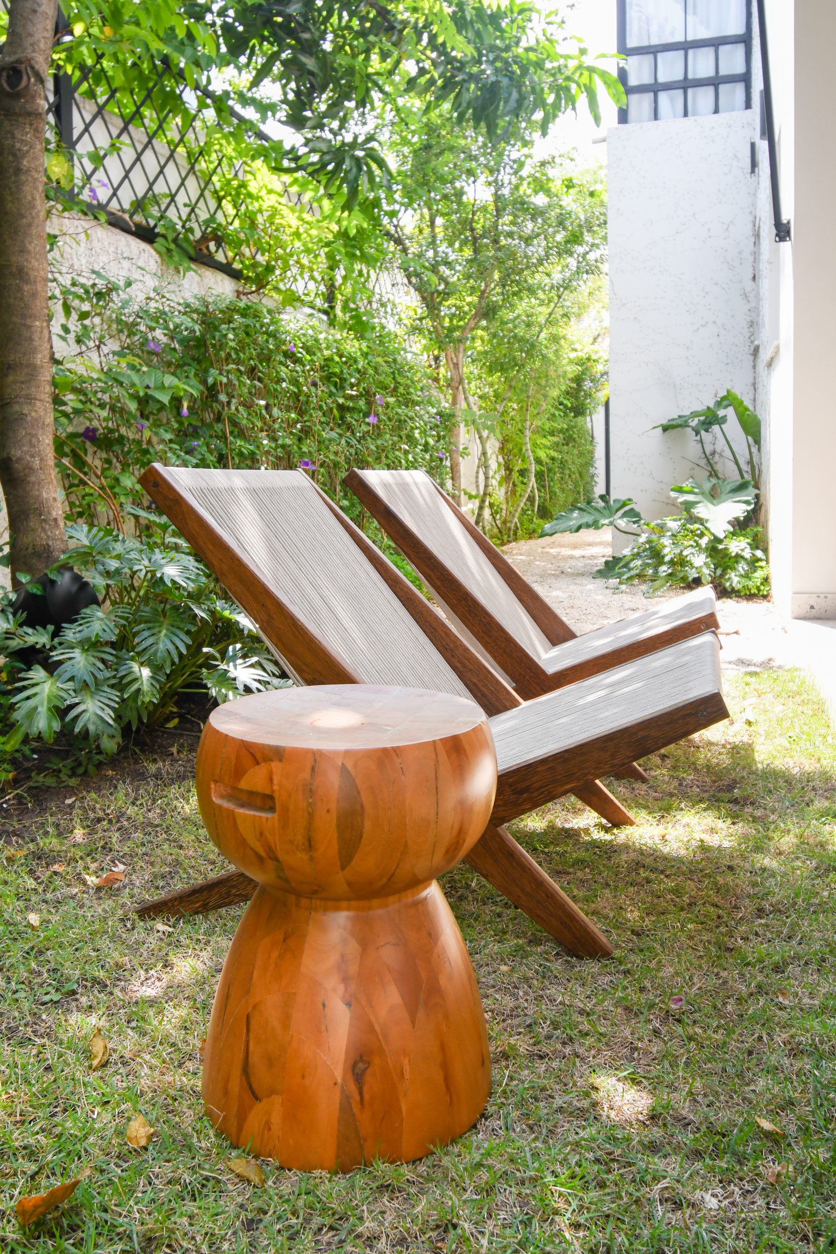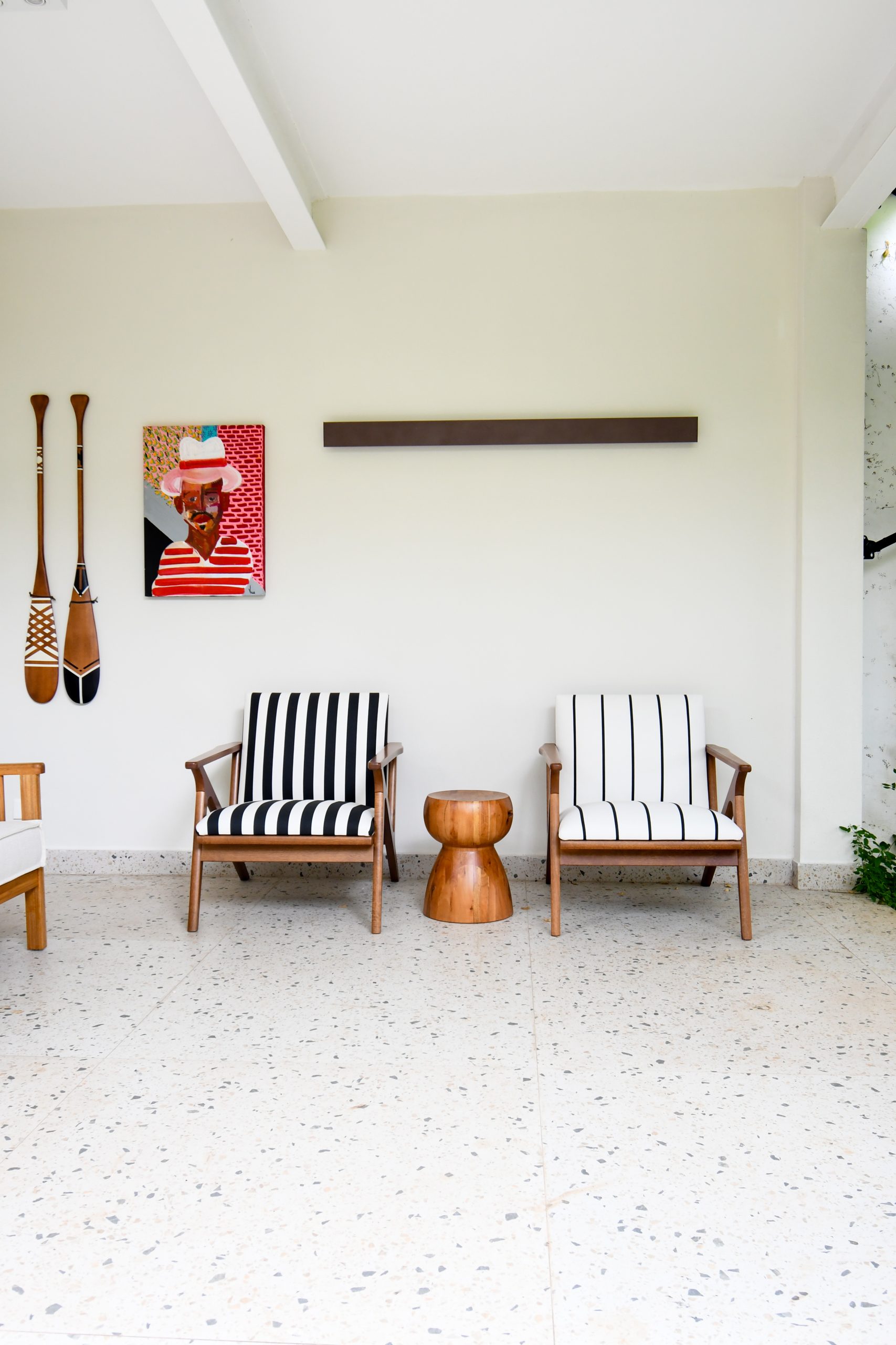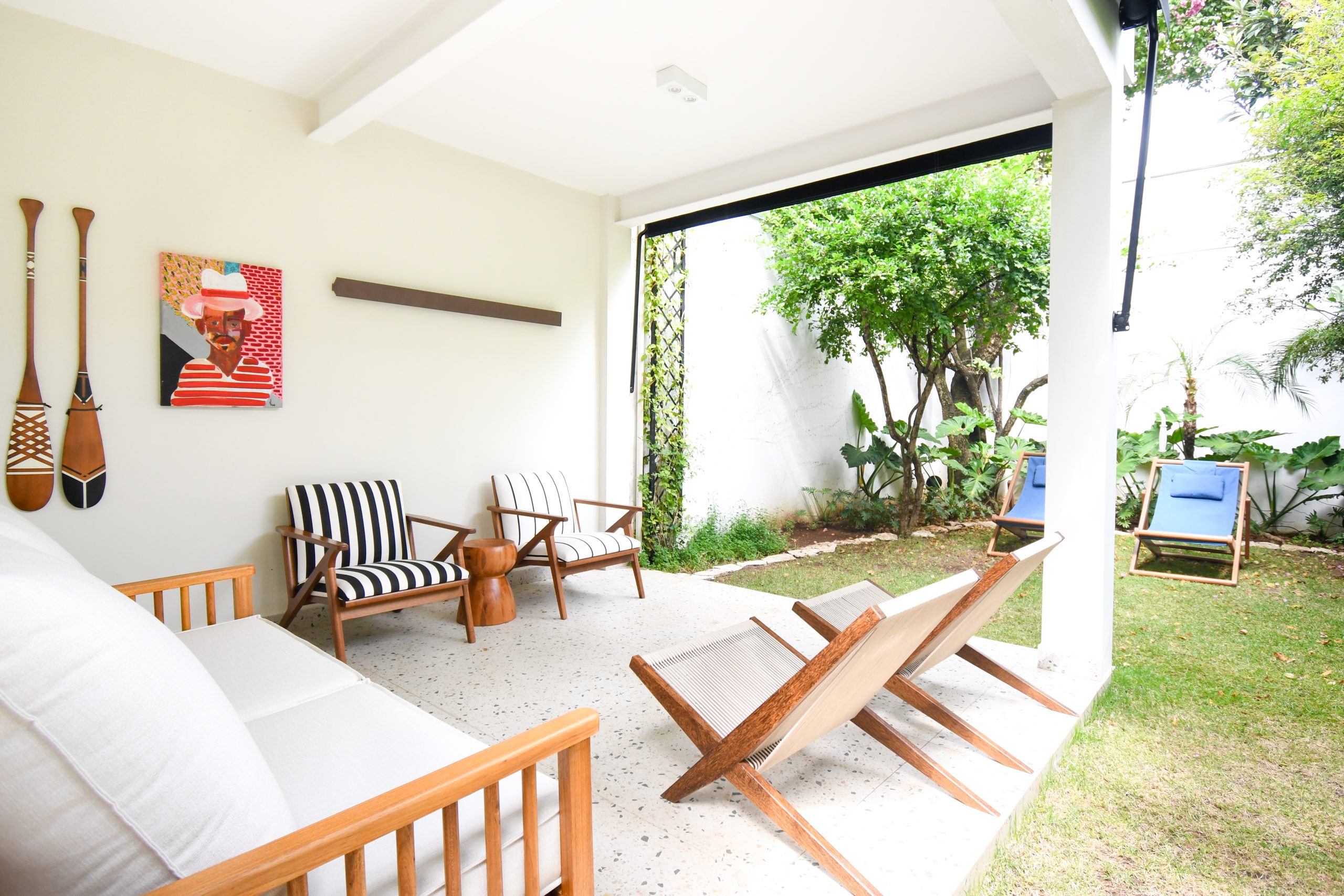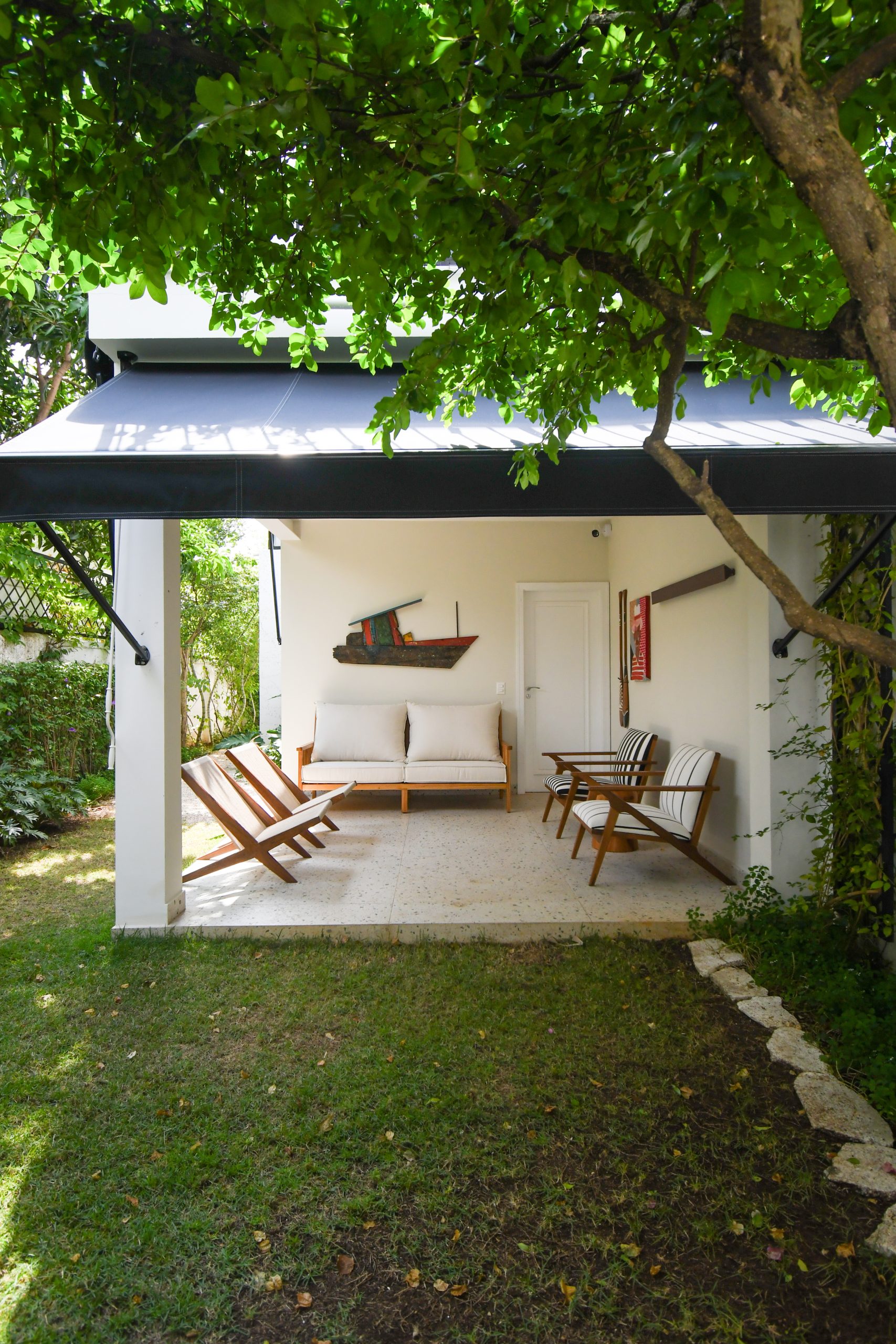 Na área externa, as poltronas da Casa Ática com encostos em corda trazem rusticidade moderna, contrastando com o conforto do sofá da Franccino e das poltronas listradas da Regatta.
